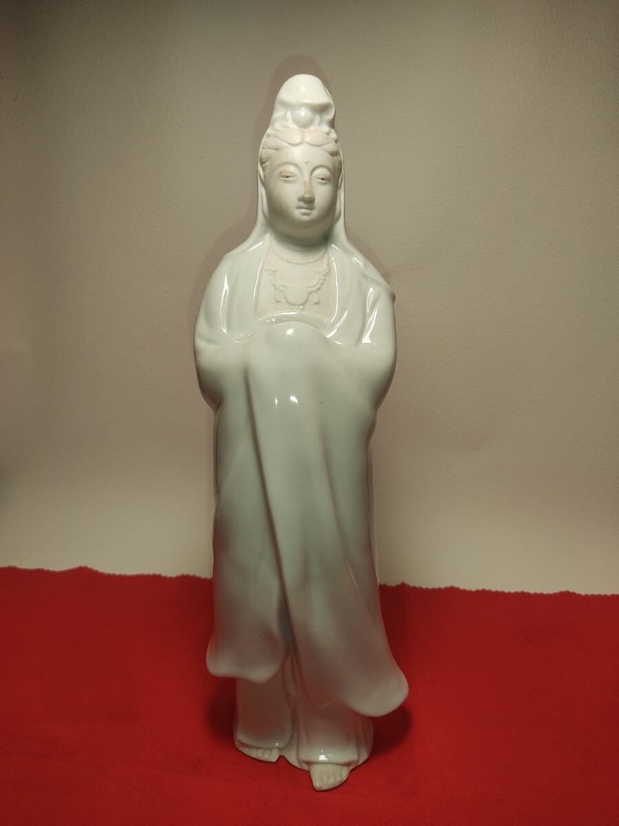 The statue is an exquisite piece, distinguished by the translucent white color and smooth texture of its white porcelain. The gentle expression on the face and the flowing drapes of the robe are meticulously rendered, bringing a sense of peace to anyone who looks at it.