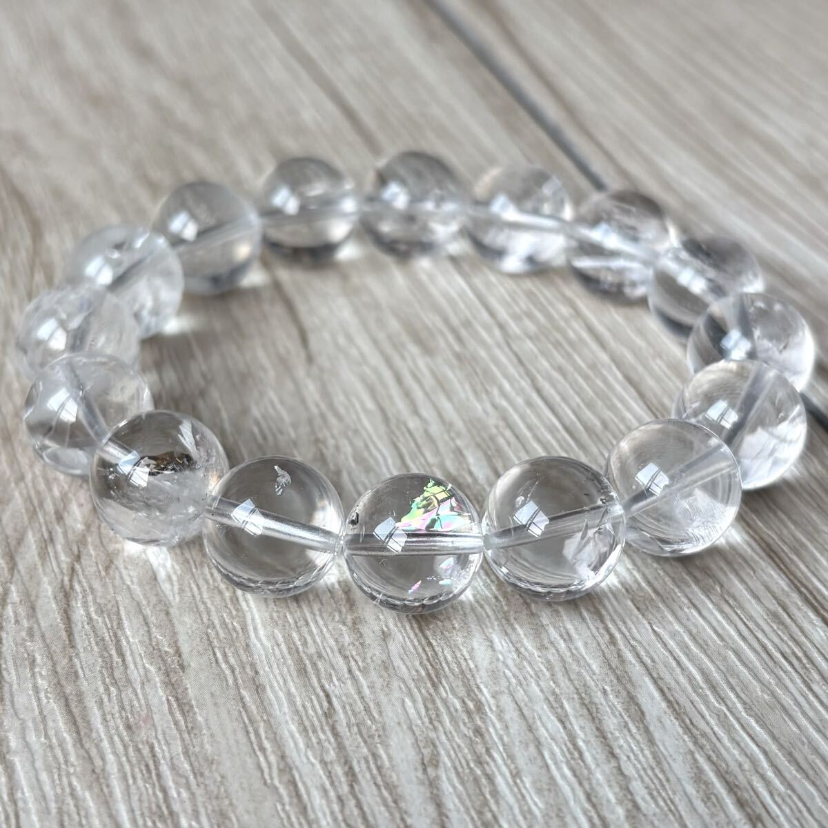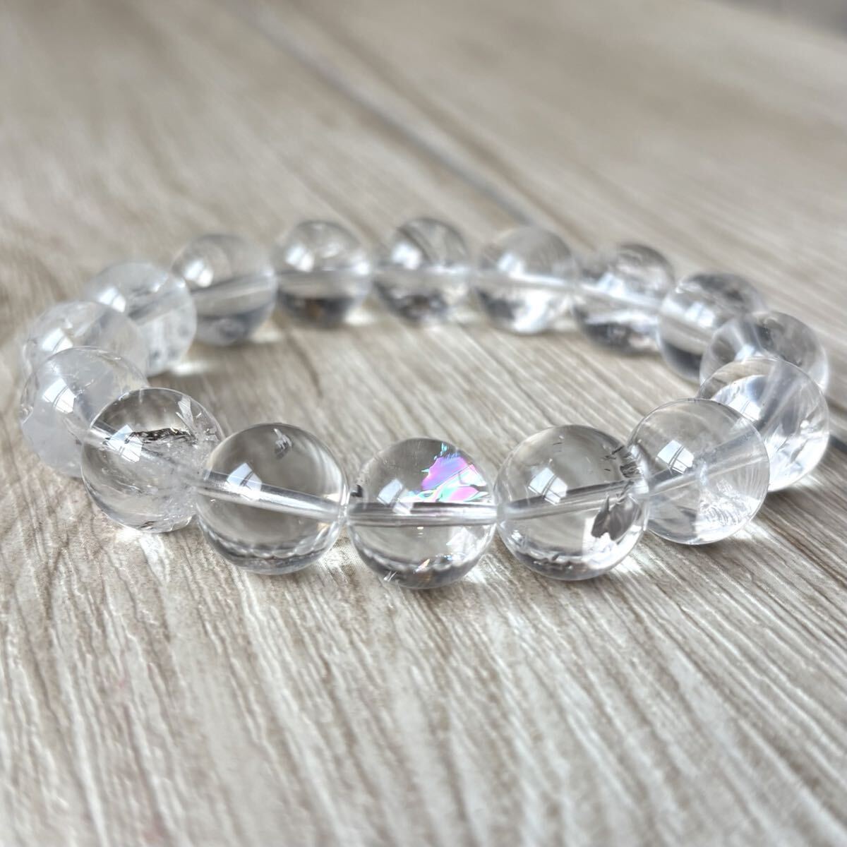 綺麗な透明の水晶に、ヒビ(クラック)やインクルージョン(内包物)が入り込み、その部分に光が当たることで見事な虹色の輝きを見せてくれます