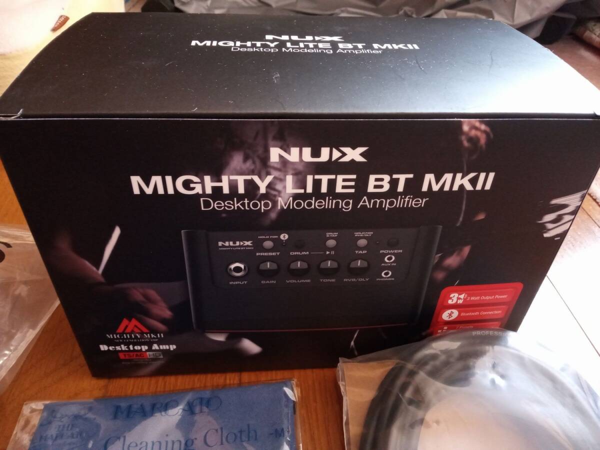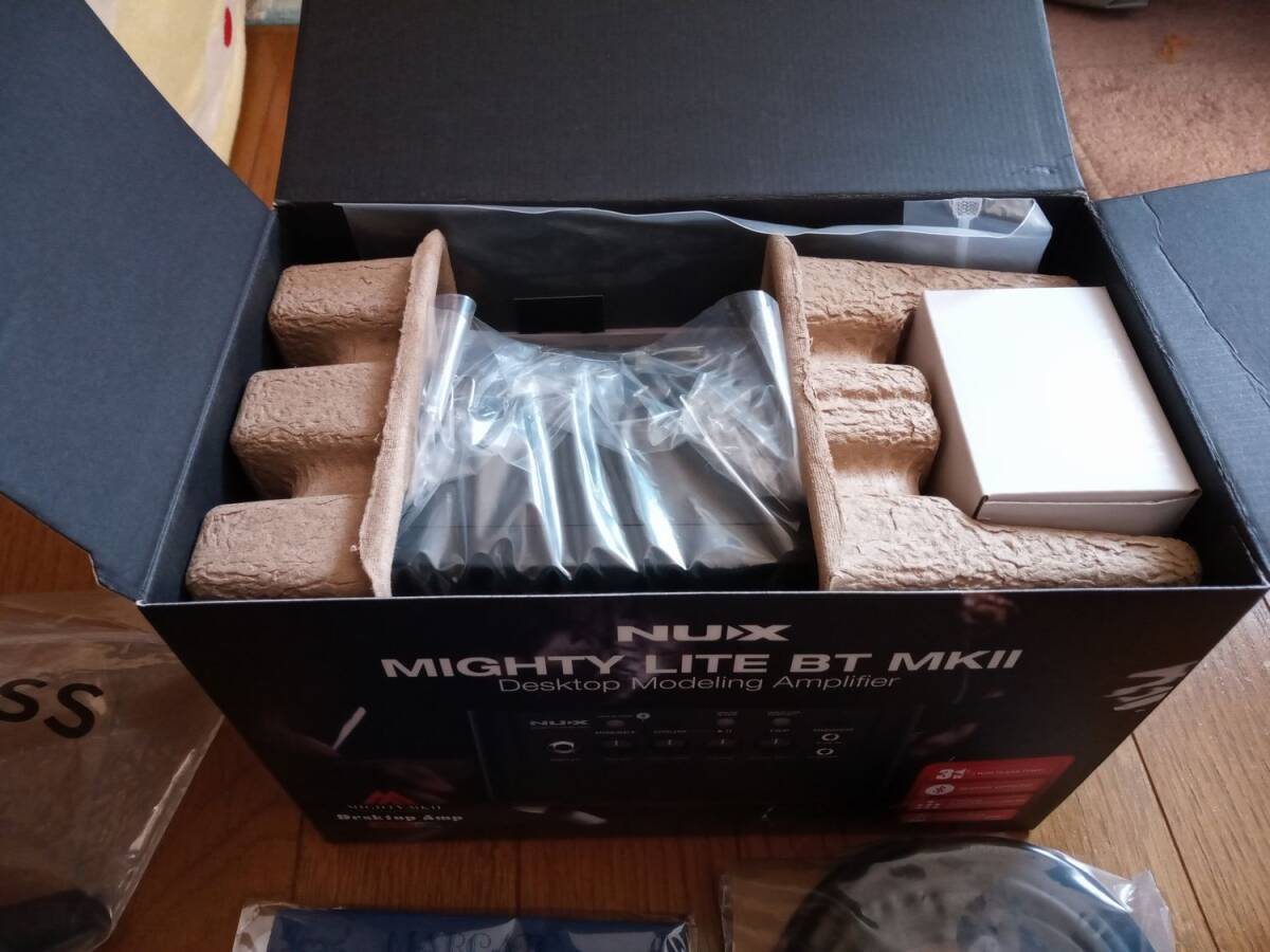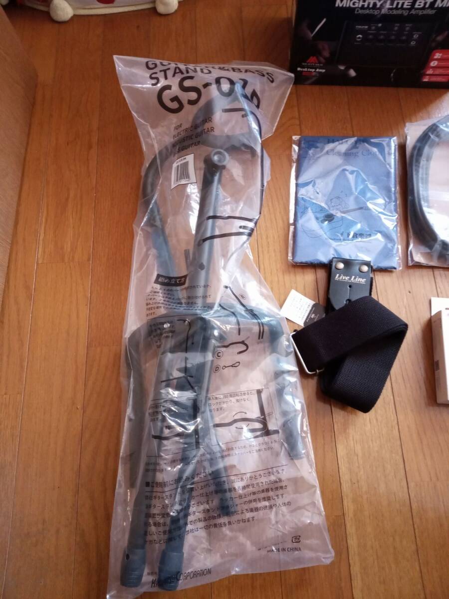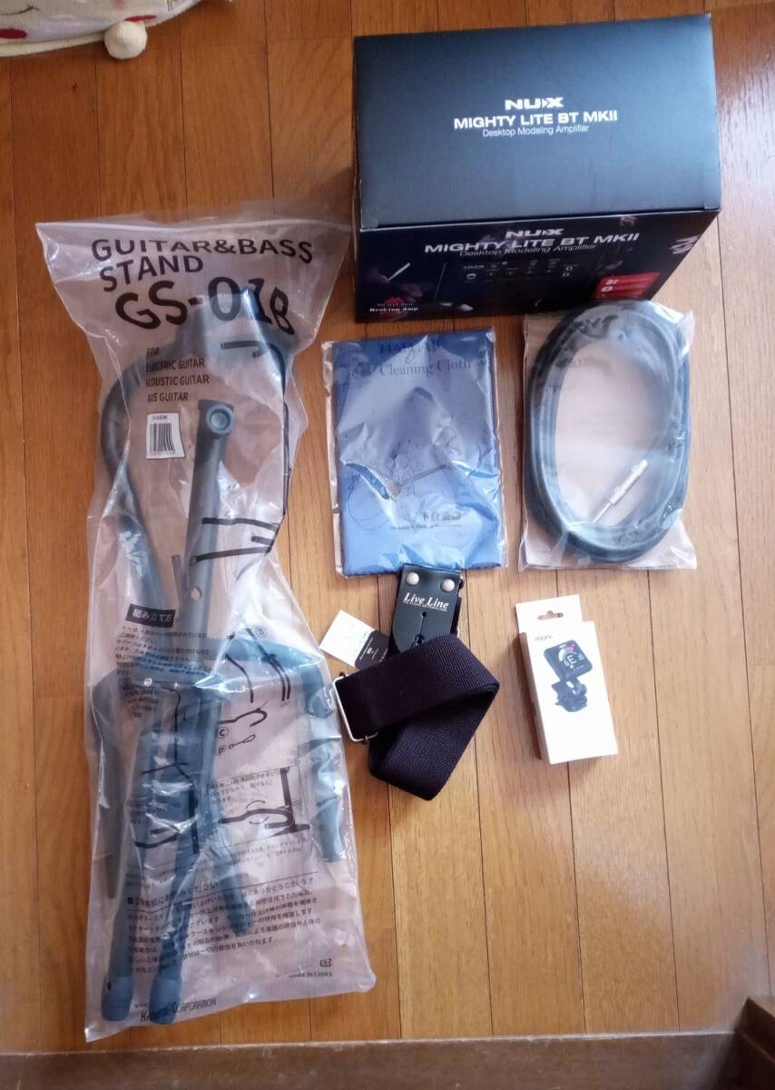 ギター本体、スタンド、チューナー、アンプ、コード、クリーナー、ソフトケース、ピック、肩掛けベルトです。