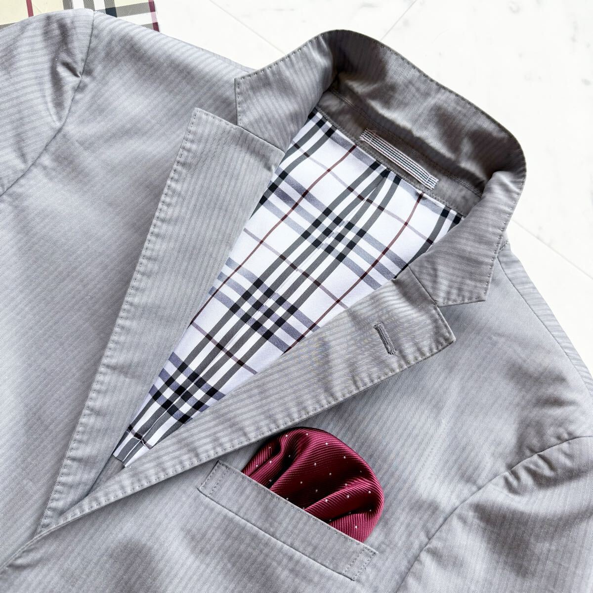 入手が困難になり大人気のブランド、バーバリーブラックレーベルの裏地が希少なホワイト地のノバチェック柄で着心地の良いストレッチの効いたオシャレな光沢の美しいジャケットです。
