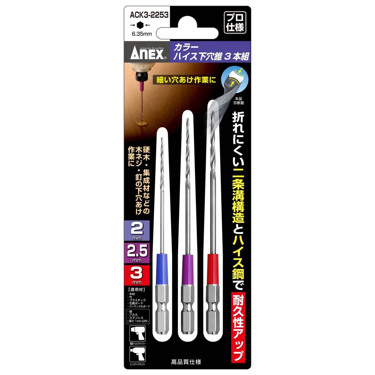 【在庫処分】カラー仕様 ハイス鋼 3本組(2/2.5/3mm) 下穴錐 ACK3-2253【釘やビスの下穴あけなどの作業に】 アネ