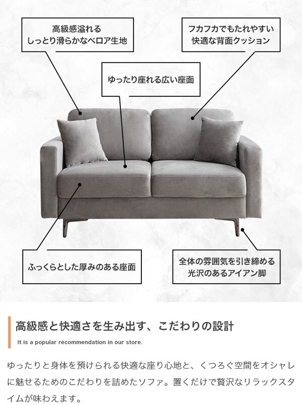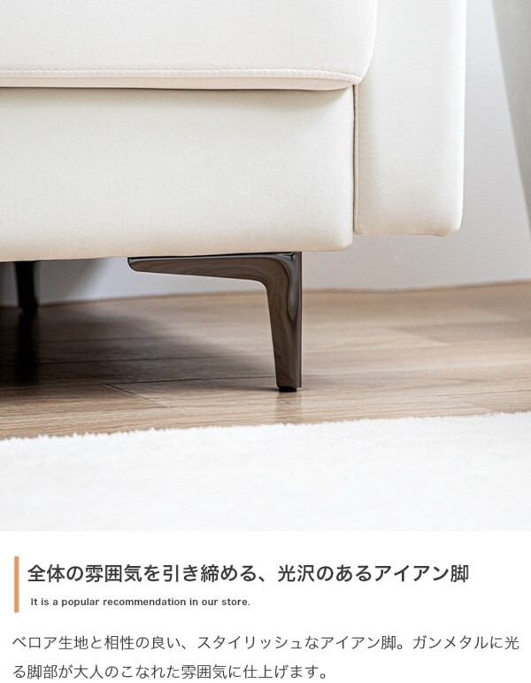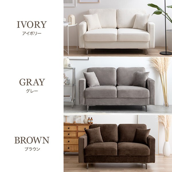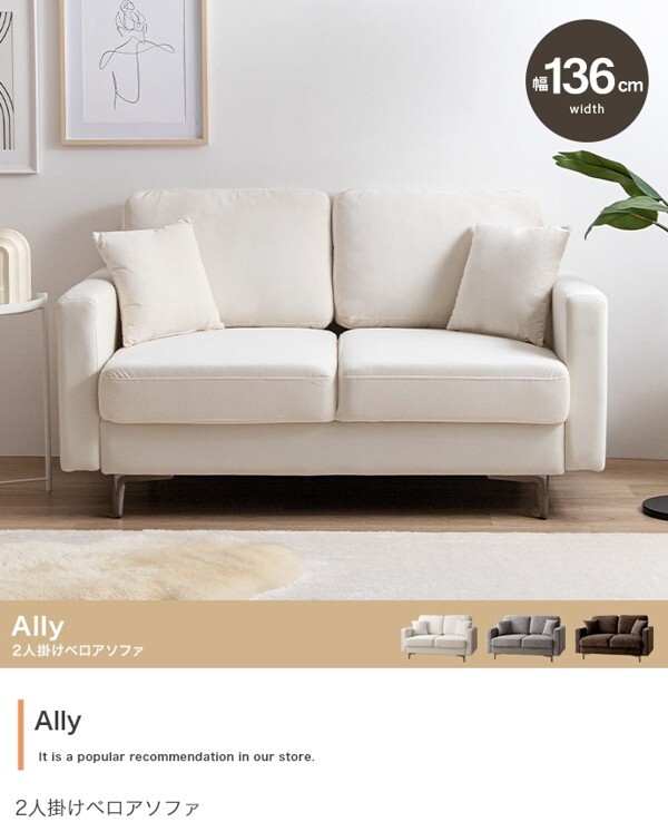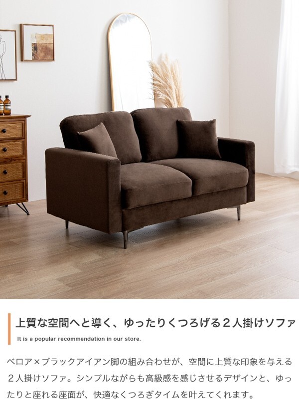 ※現在ご覧の商品ページはブラウンのご購入ページとなります。 ヤフオクの仕様上単一ページに複数バリエーションを掲載することができませんので、他バリエーションが希望の場合は別ページでご購入お願い致します。 上質な空間へと導く、ゆったりくつろげる『Ally(アリー)』シリーズの2人掛けソファ。 ベロア×ブラックアイアン脚の組み合わせが、空間に上質な印象を与える2人掛けソファ。 シンプルながらも高級感を感じさせるデザインと、ゆったりと座れる座面が、快適なくつろぎタイムを叶えてくれます。 配達業者を指定いただくことはできません。 沖縄・離島に関しましては、別途配送料が必要となります。 北海道への配送も別途配送料が必要になる場合がございます。 ※別途送料が発生する場合は後ほどご連絡させていただきます。 タイミングによっては在庫切れの場合があります。