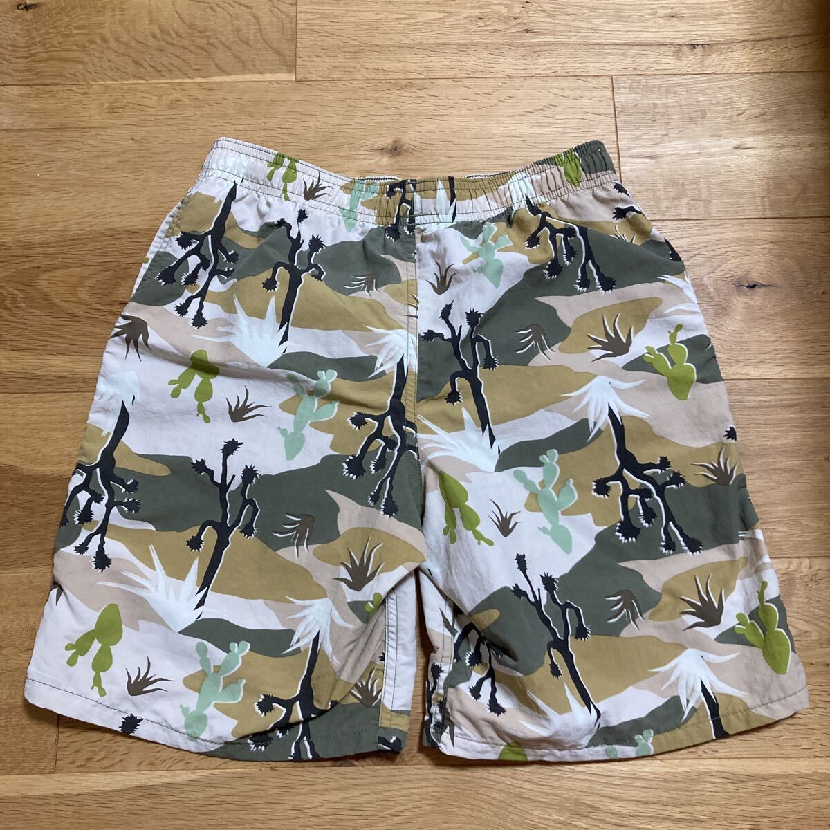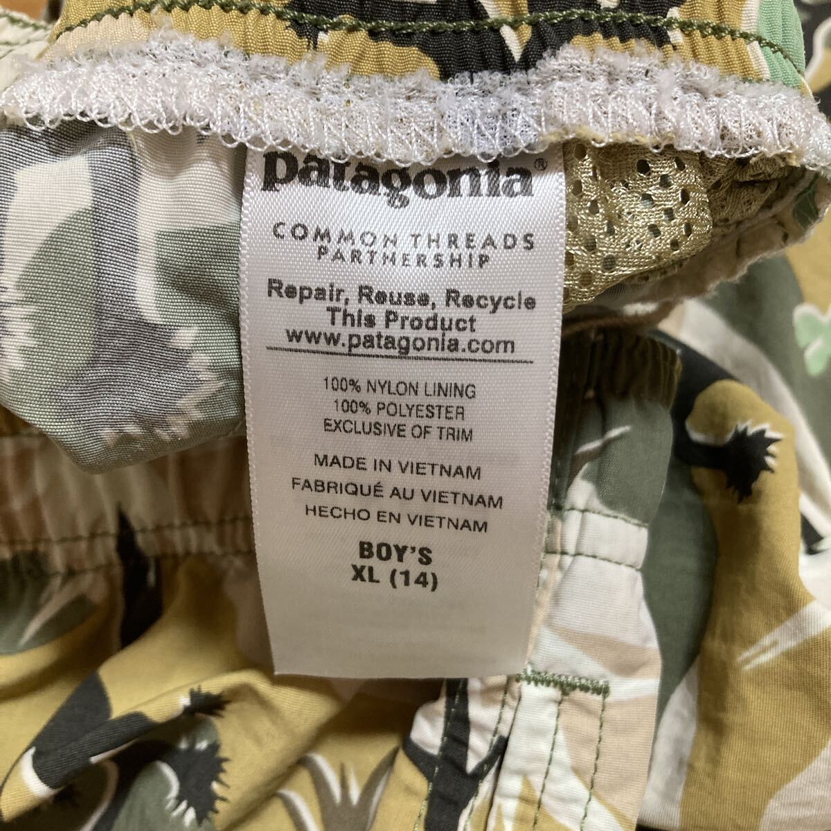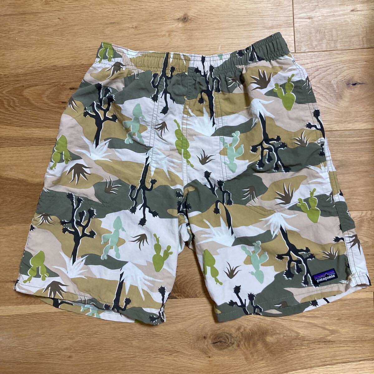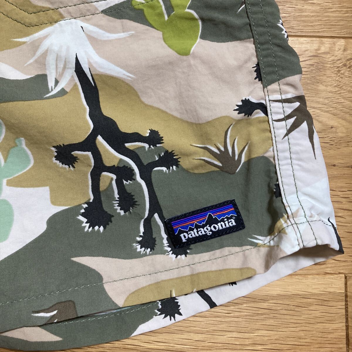 パタゴニアのカモフラージュデザインのショートパンツ、軽量で耐久性のあるナイロン素材。