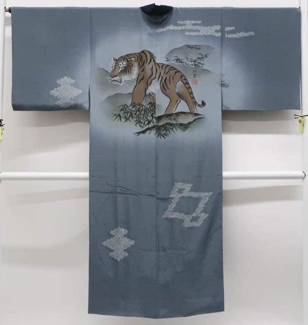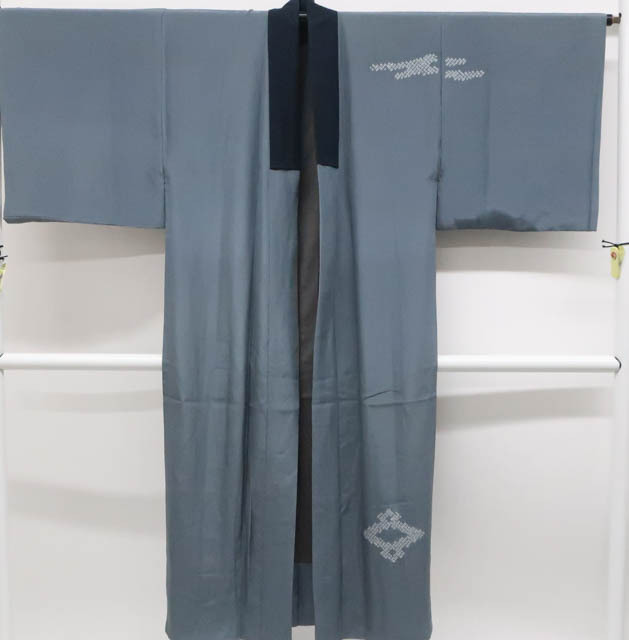 リサイクル商品のため、背縫いの縫い目が甘いですが着用可能なお品です。 地色は青みのあるグレーです。 1枚目の画像が近いお色かと思われます。 素材は正絹です。 |
