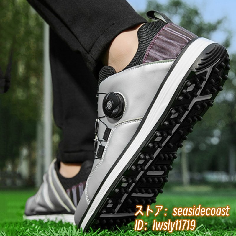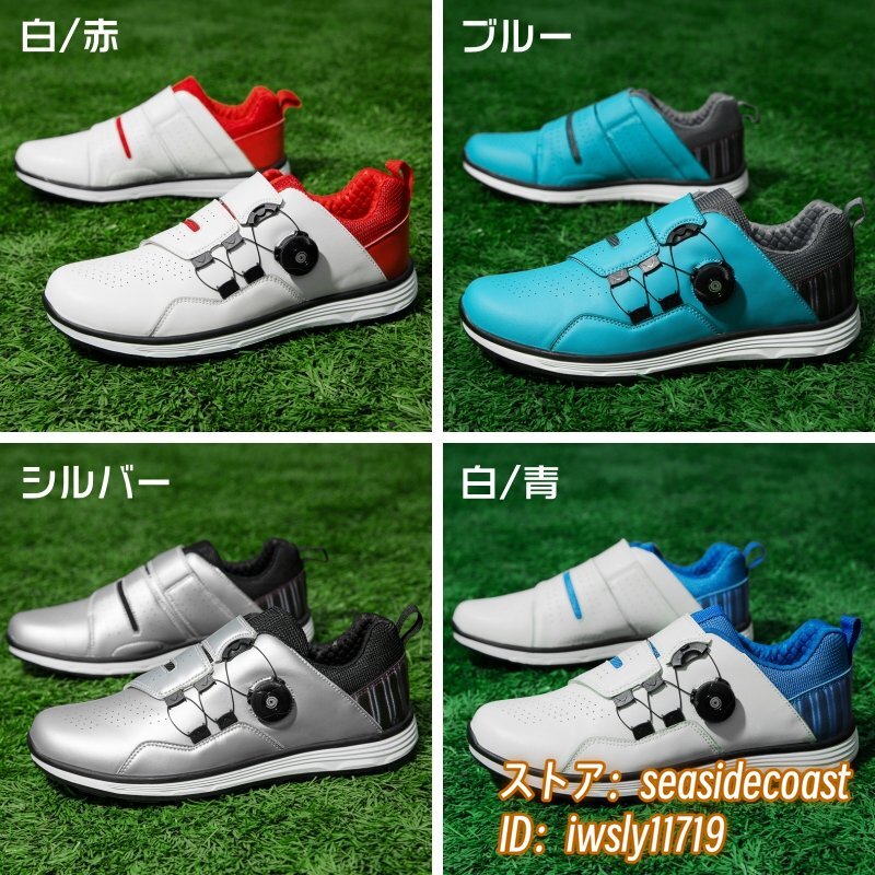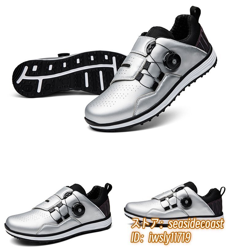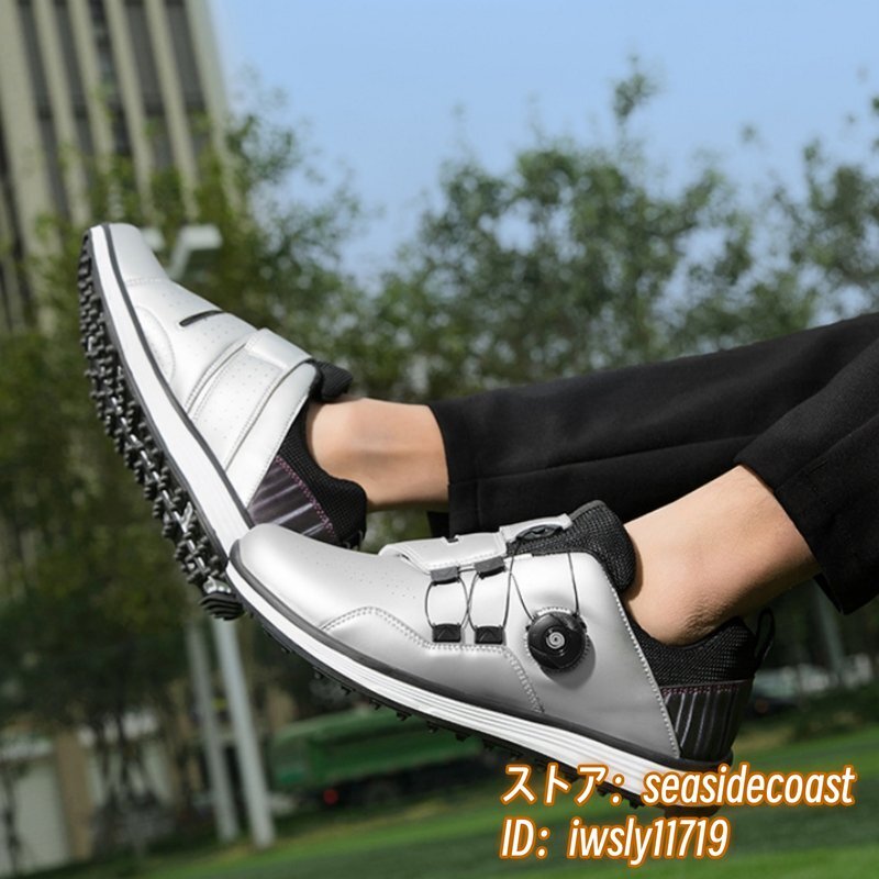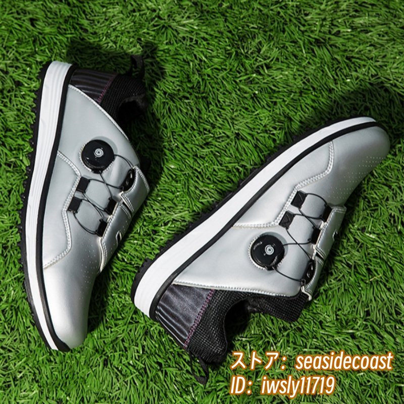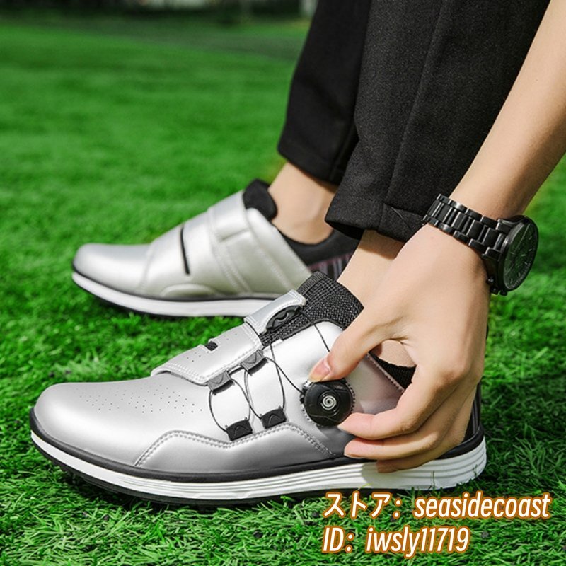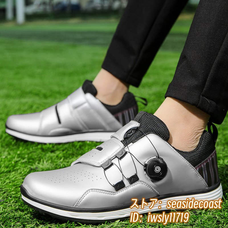 ゴルフシューズ 高級 新品 ダイヤル式 運動靴 メンズ 4E 幅広い フィット感 軽量スポーツシューズ 防水 防滑 耐磨 弾力性 シルバー 25.5cm