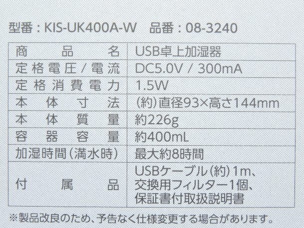 | 【未使用】USB卓上加湿器 ホワイト KIS-UK400A-W/B> | ||||||||||||||||||||||||||