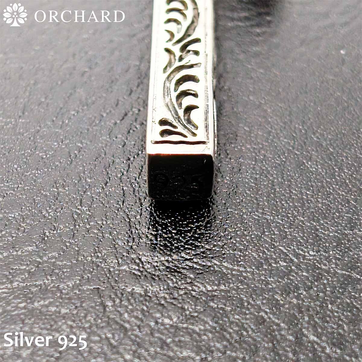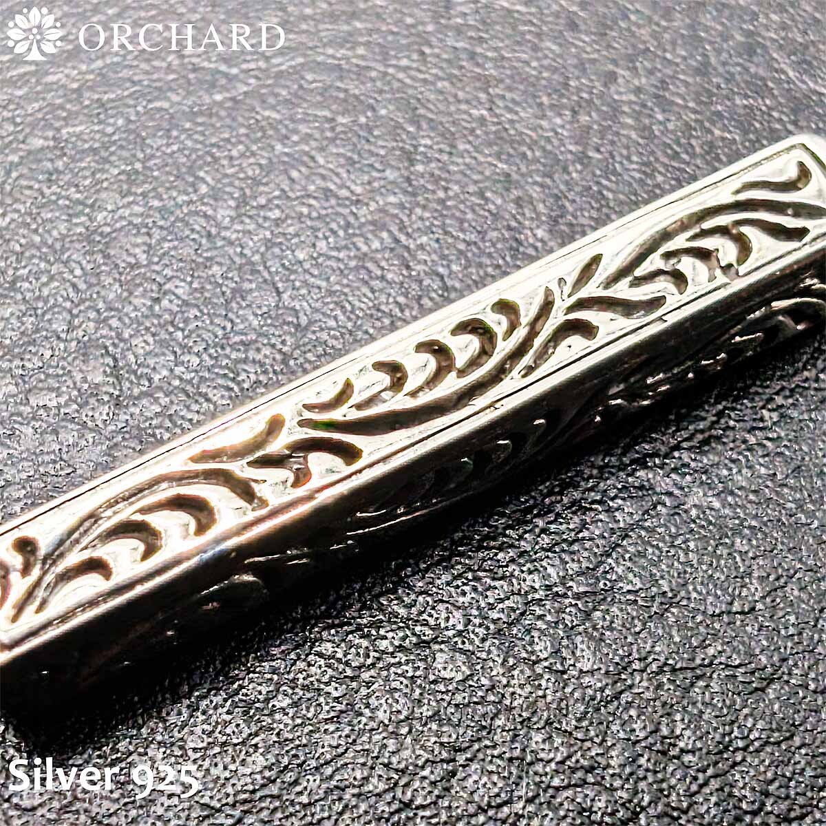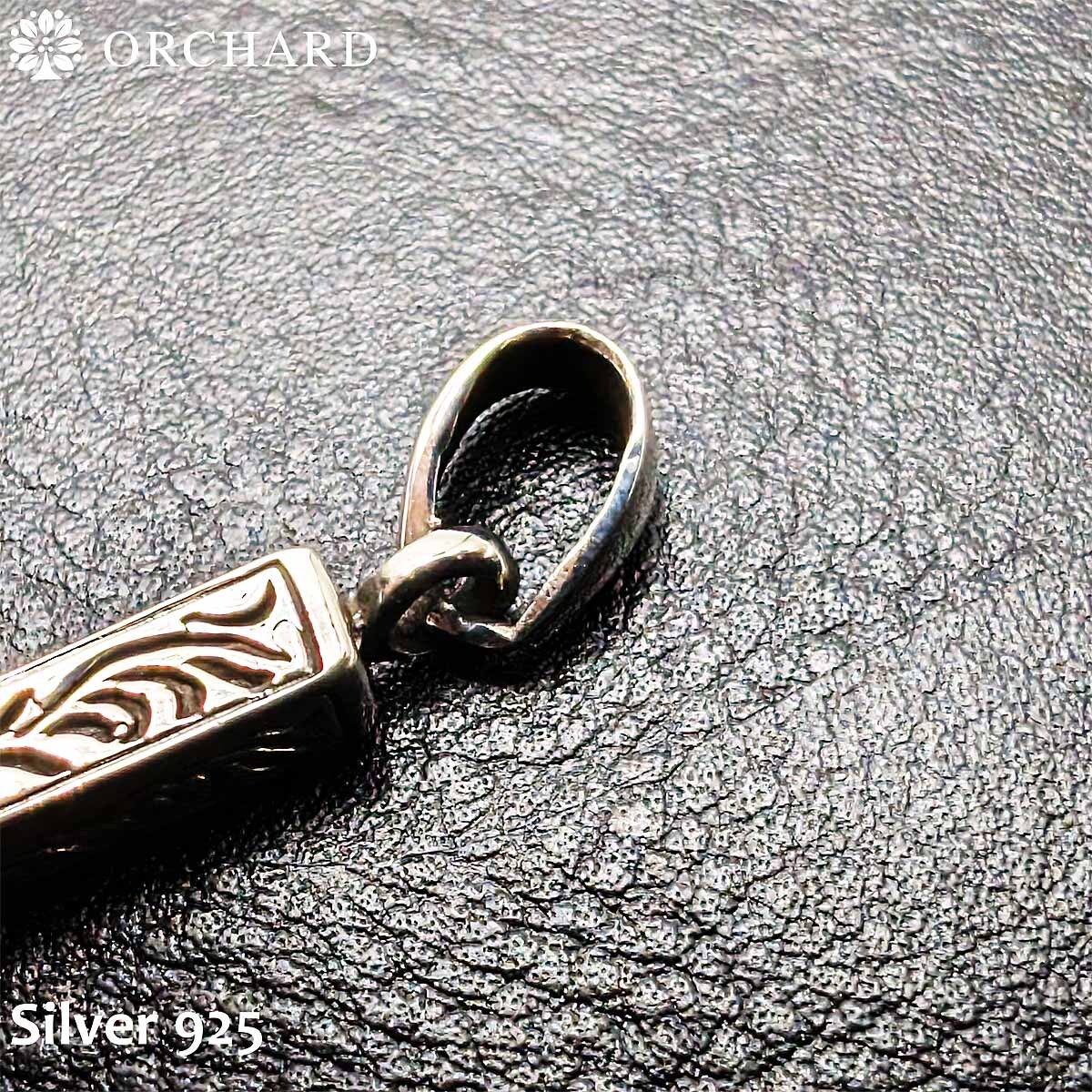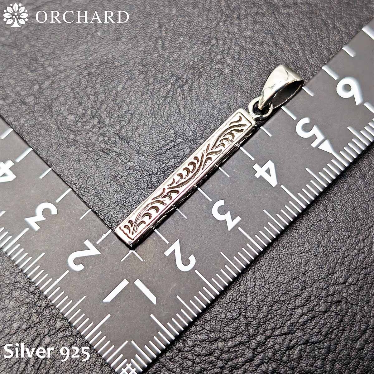 シルバー925製のバーペンダントです。表面には繊細なスクロール模様が施されており、細身のシルエットながらも高級感を感じさせるデザイン。重さ約6gと軽量で扱いやすく、首元にさりげなく輝きを添えます。バチカン径は5mmのため、細めのチェーンとの相性が良く、男女問わずご利用いただけます。カジュアルからフォーマルまで幅広く活躍する万能アイテムです。