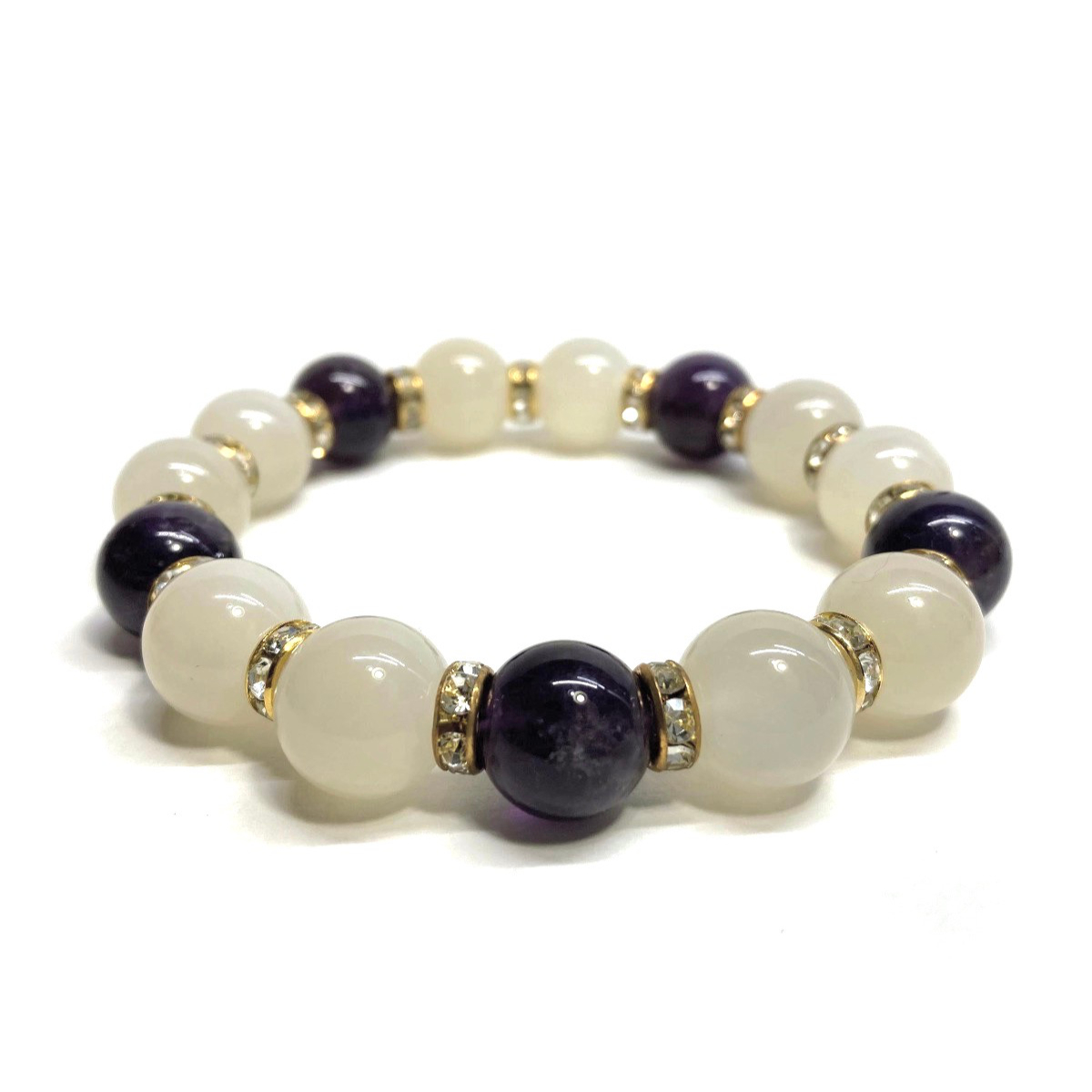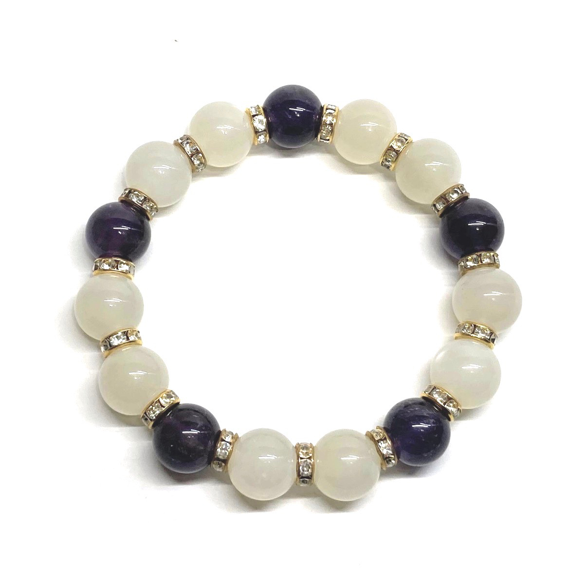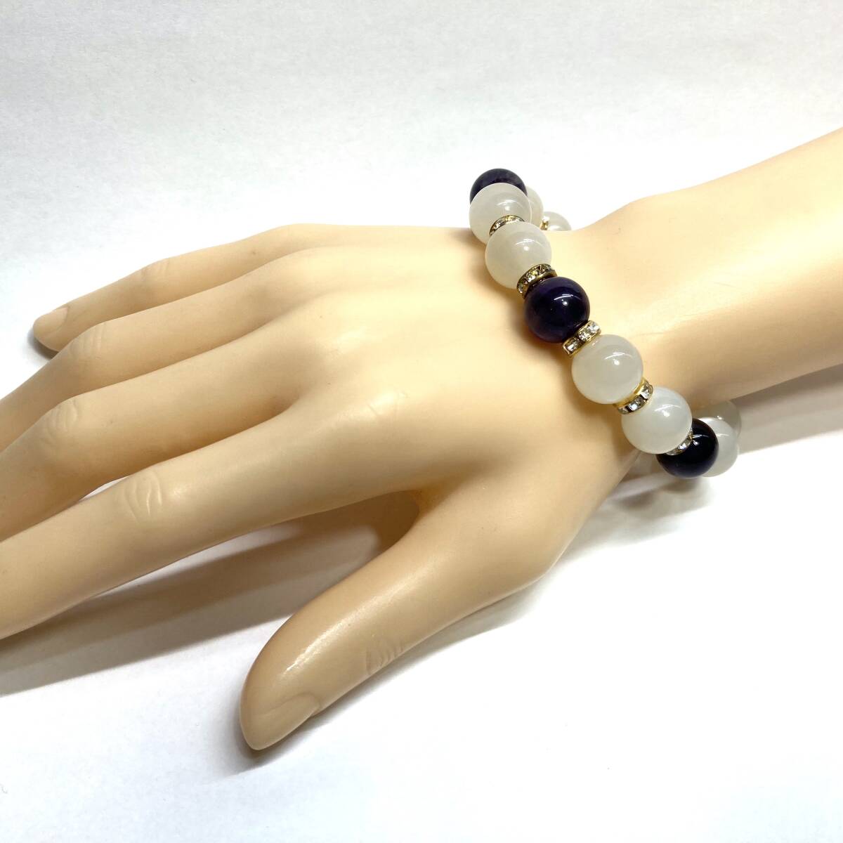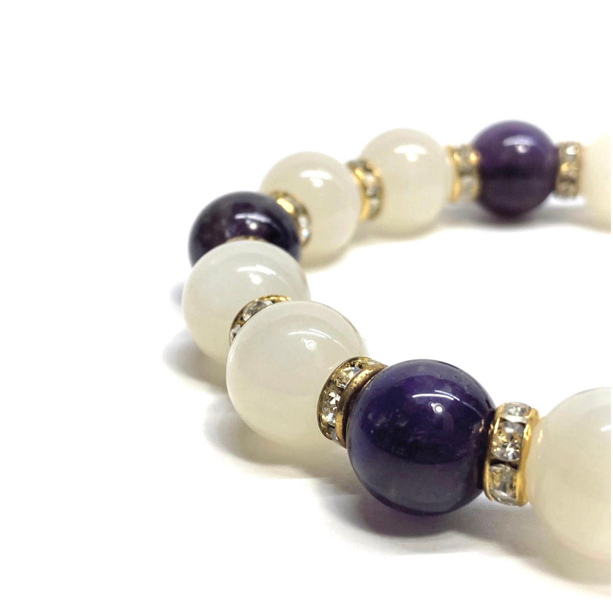 こちらは、ムーンストーンとアメジストを組み合わせたパワーストーンブレスレットです。間にはロンデルを挟み高級感あるデザインに仕上げております。程よくインパクトがある12mm玉を使用して内周約18cmです。(サイズ変更の場合は取引ナビにてご連絡をお願いします。) 数に限りがございますので気になる方はお早めにどうぞ。