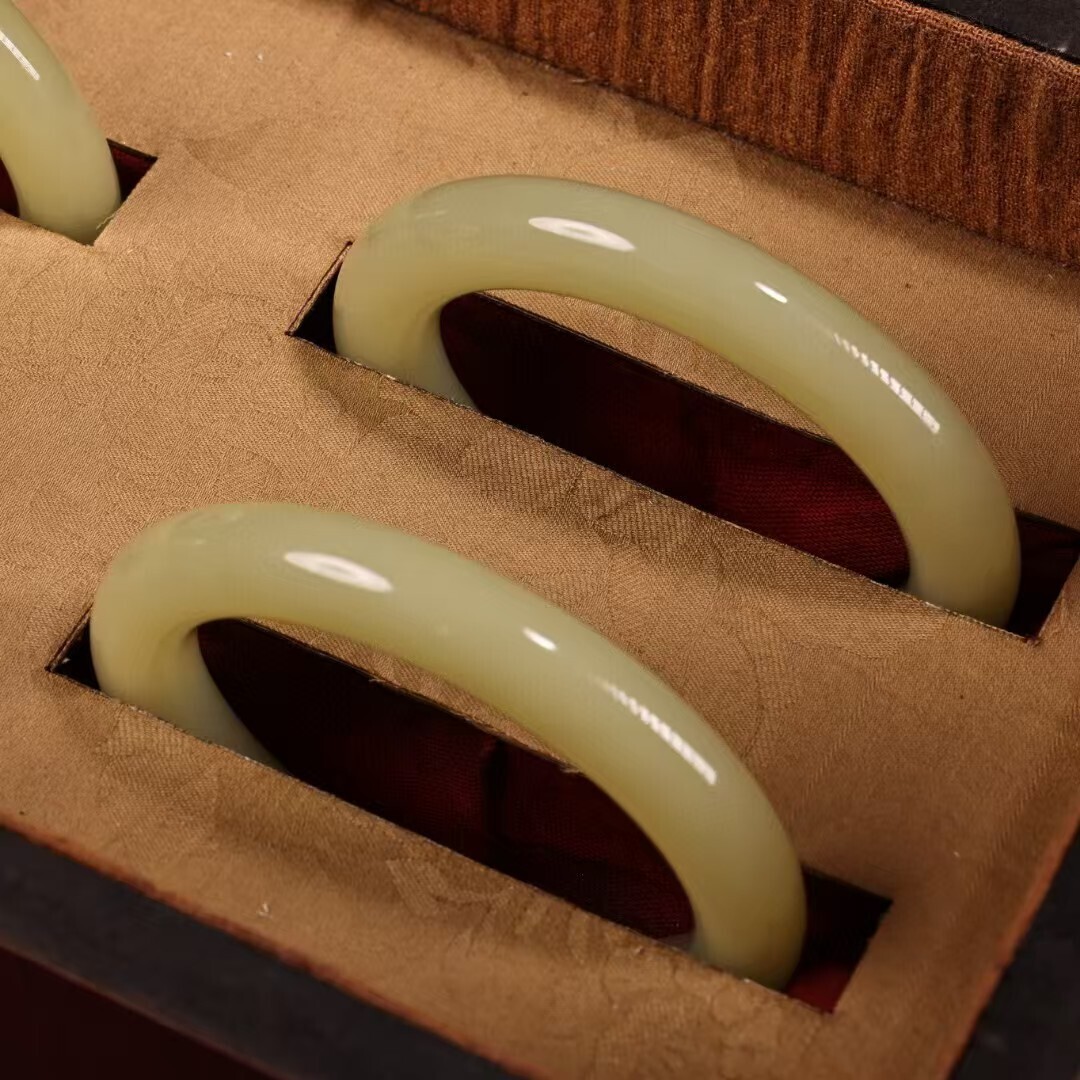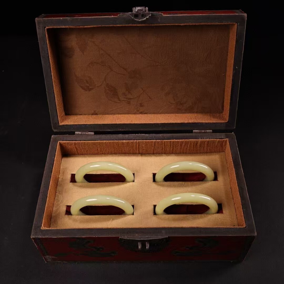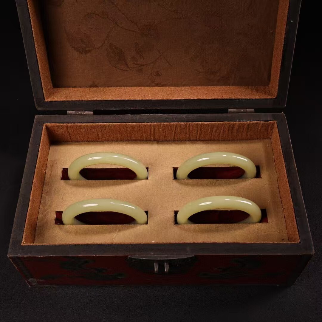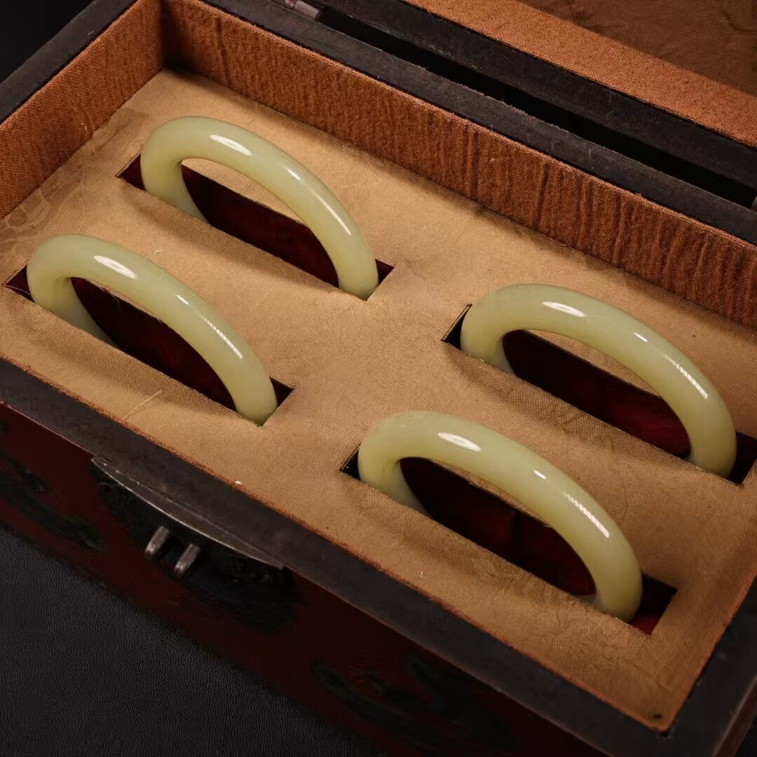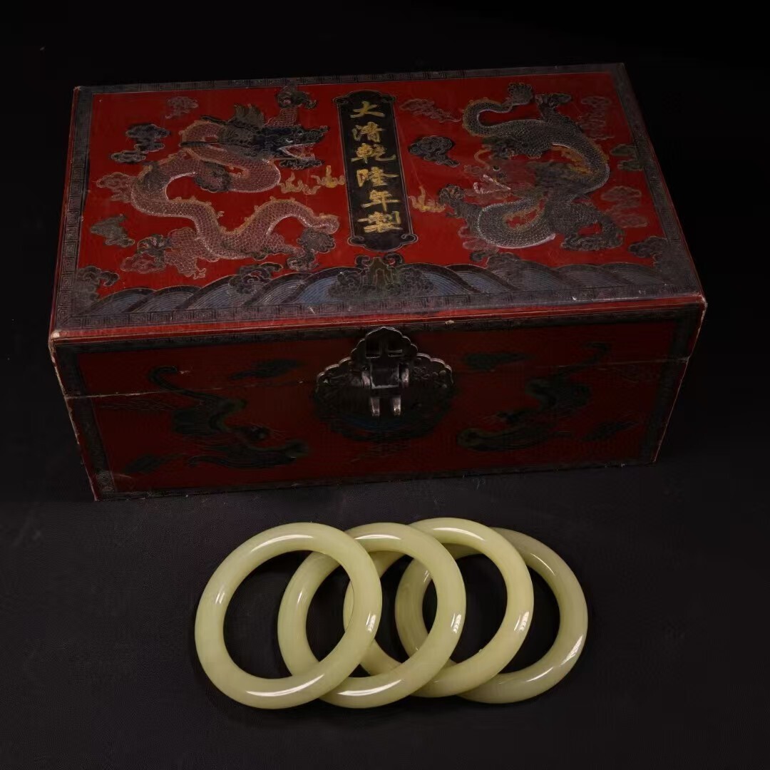 珍品旧蔵 清代宮廷御藏 中国古美術 罕見青白玉手 老漆器箱付 完品 重約80g 内径58-60mm 骨董品 收藏品 文房置物 古玩 装身具 R07072610