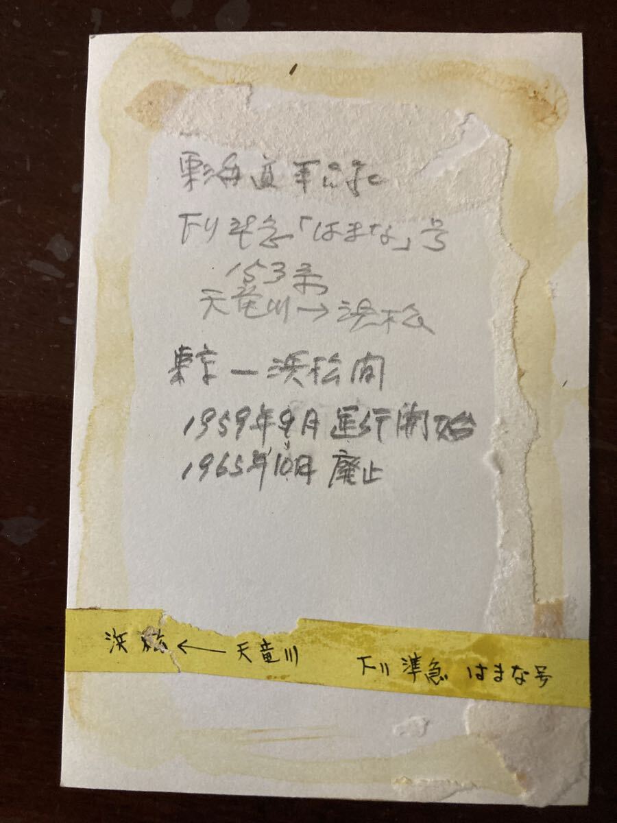 はまな号は1959ねー9月運行開始、1965年10月廃止。裏面にアルバムからの剥がし跡があります。