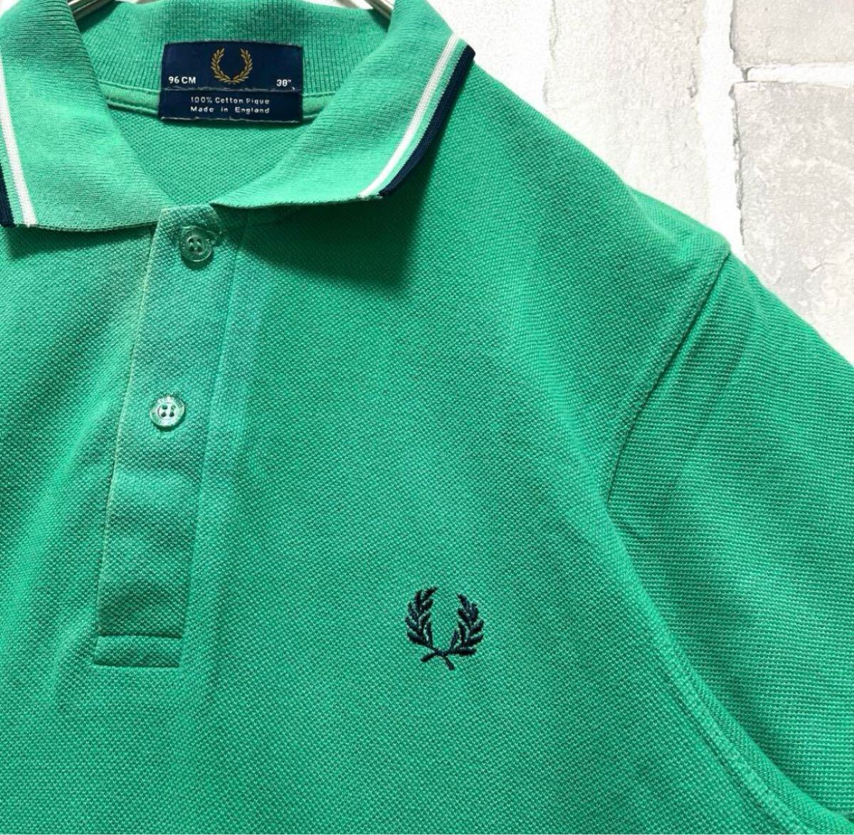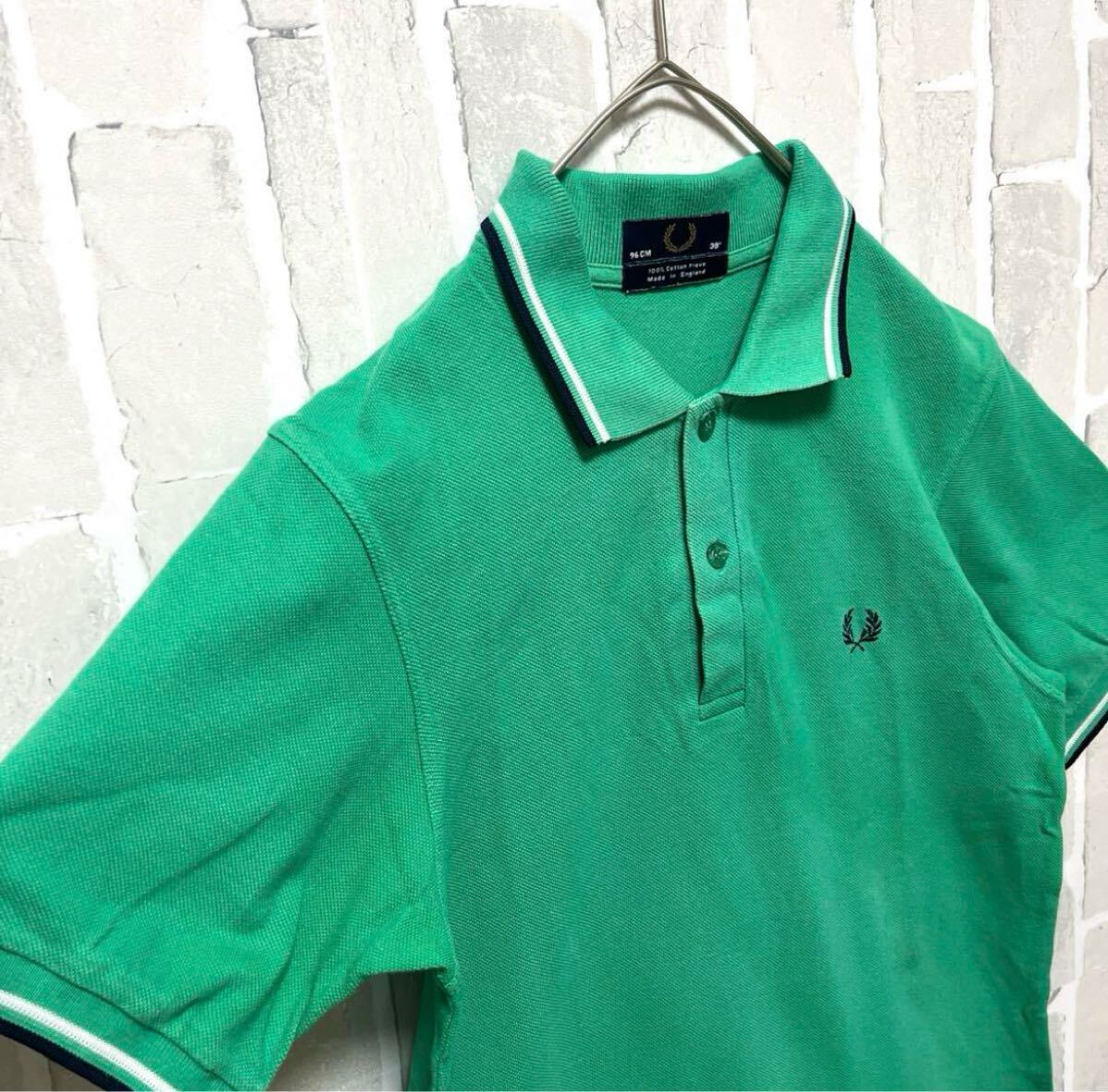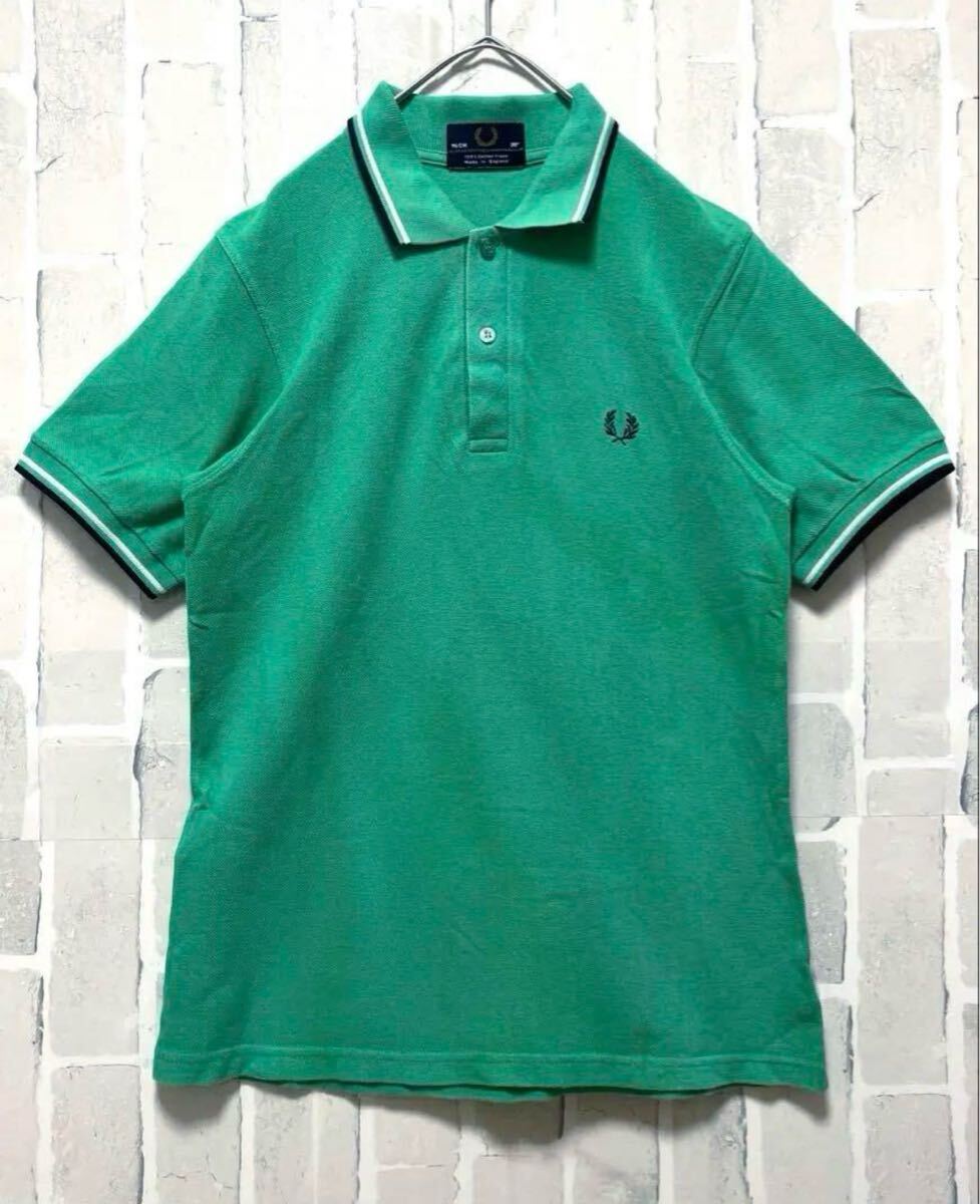 FRED PERRY フレッドペリー ワンポイントロゴ シンプルロゴ 刺繍 ポロシャツ サイズM 半袖 グリーン イングランド製 英国製 鹿の子 リブライン ノームコア 送料無料の出品です。
