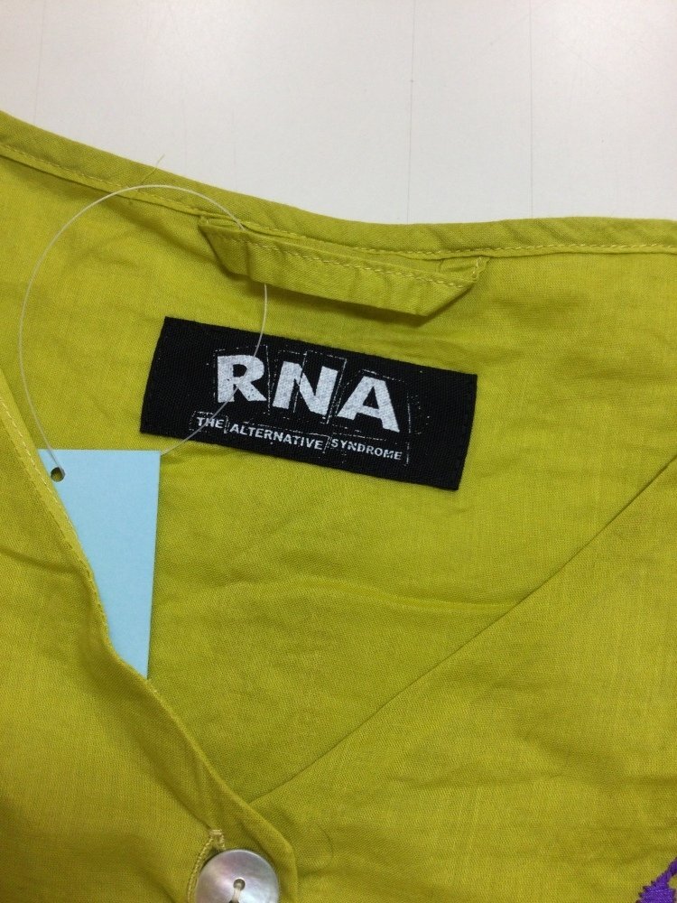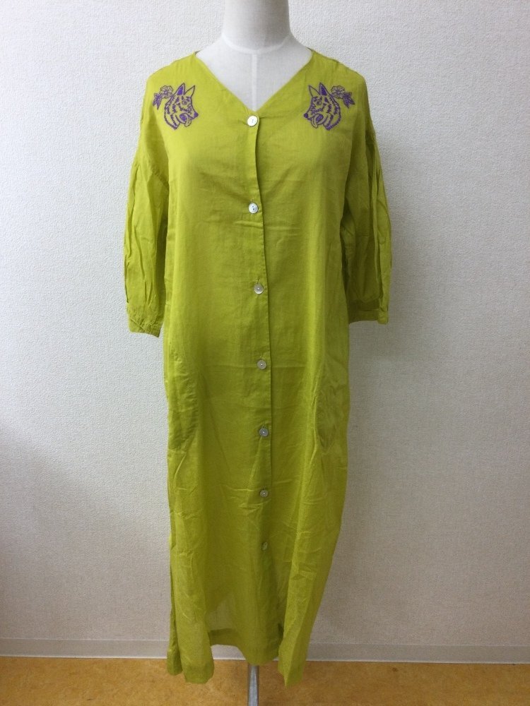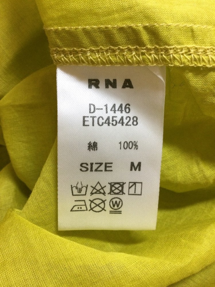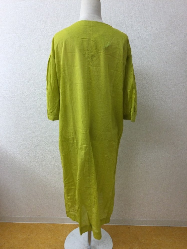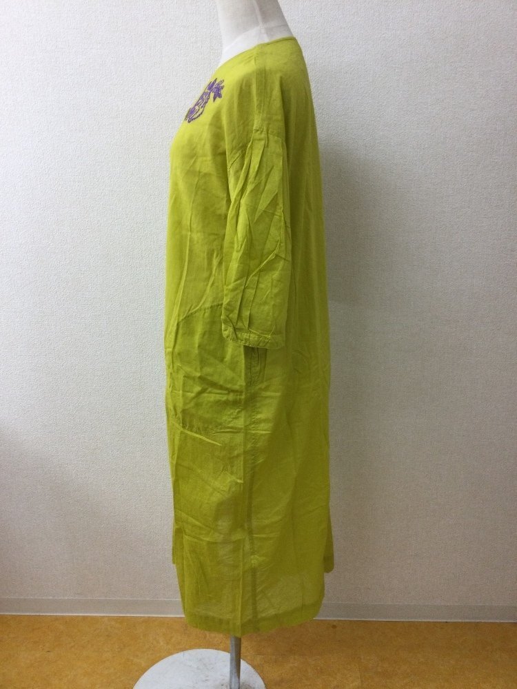 管理番号:10^134050 RNA 黄緑コットンワンピ 透け感あり 紫の刺繍 表示サイズ:M 実寸(参考)