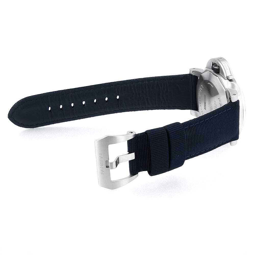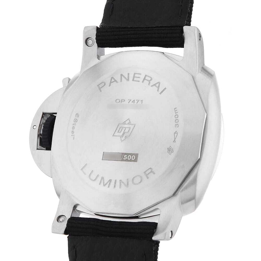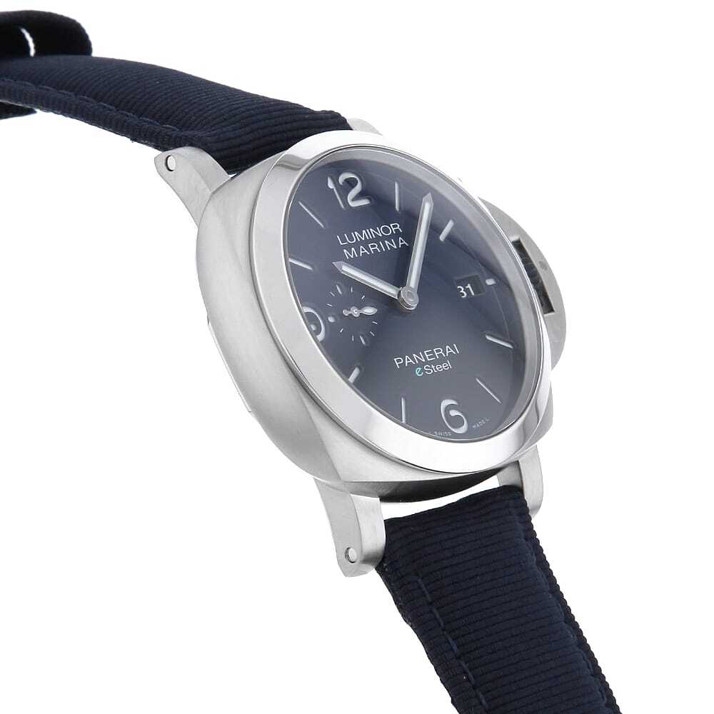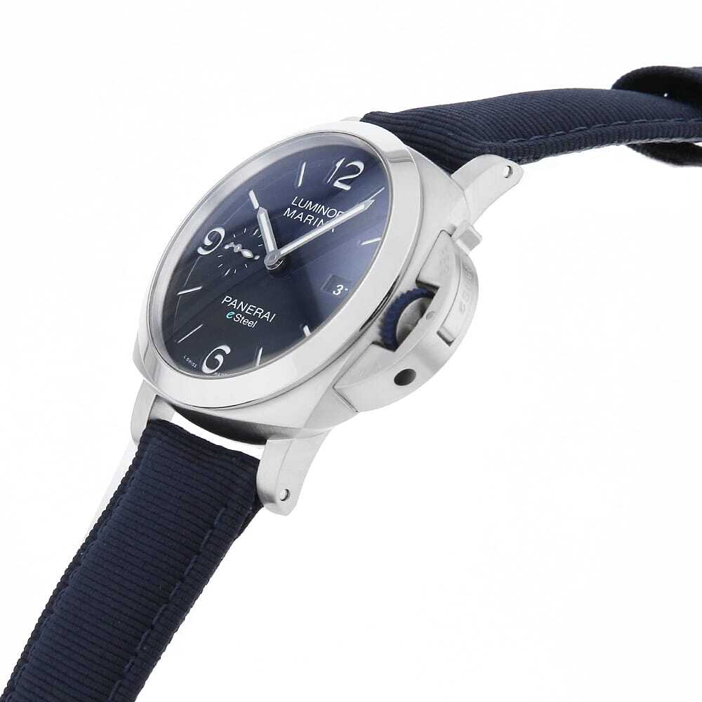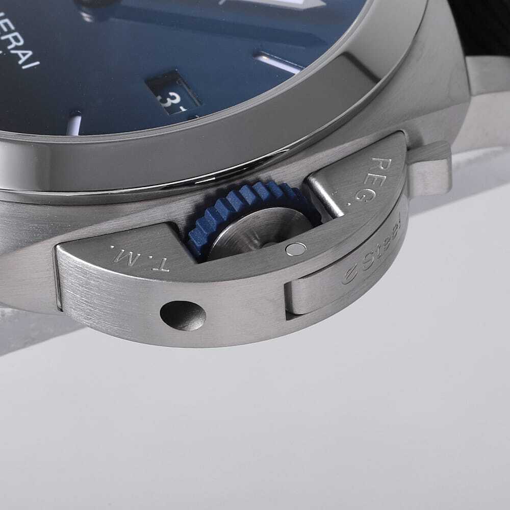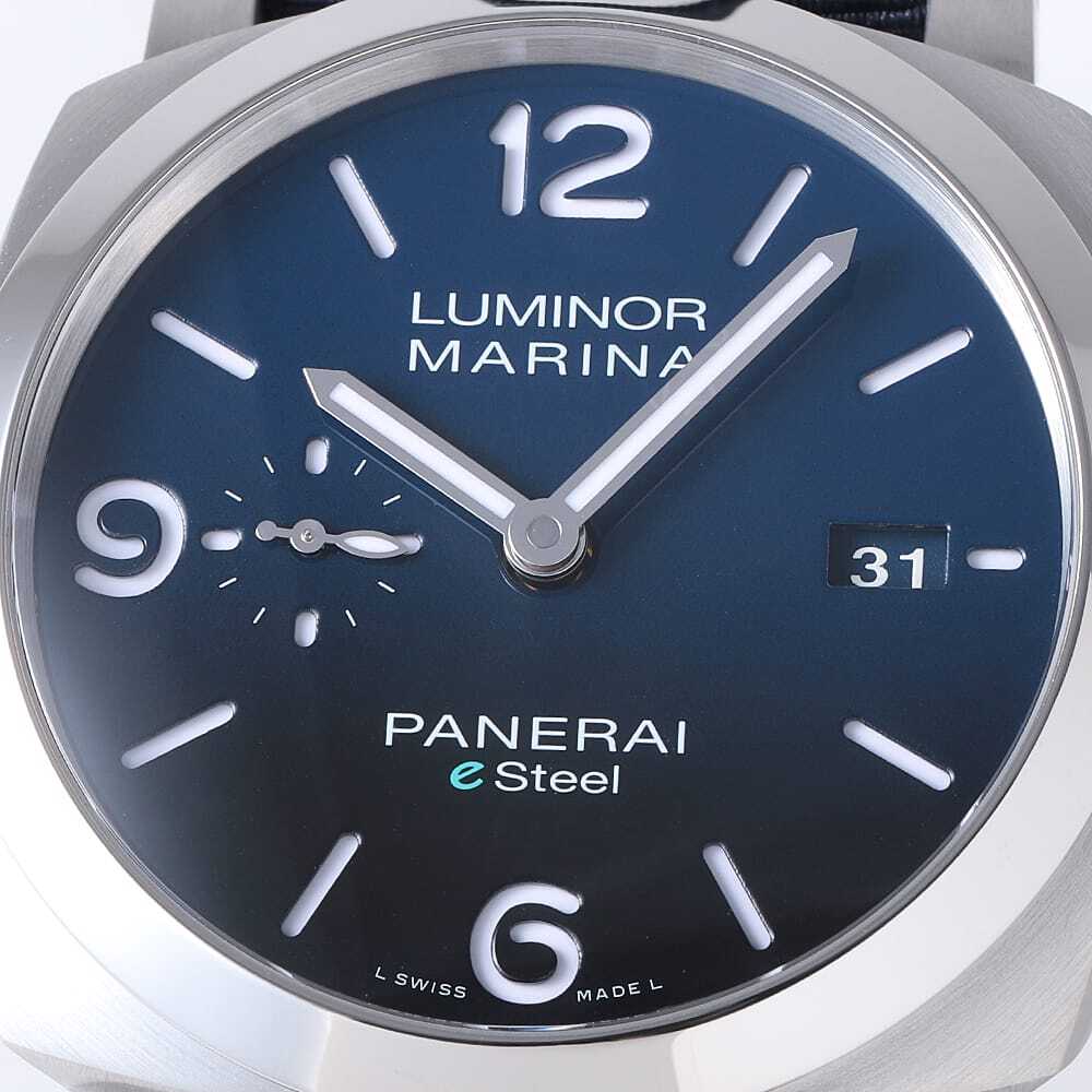 モデル情報 | ブランドの環境への取り組みと技術革新を象徴するモデルで、クラシックなルミノールのデザインにリサイクル素材を融合させたサステナブルなタイムピースです。パネライが開発したeSteelをケースと文字盤に採用した初のルミノールマリーナです。ブルーグラデーションダイアルは、海をイメージした深みのある色合いで、視認性と美しさを両立しています。 |