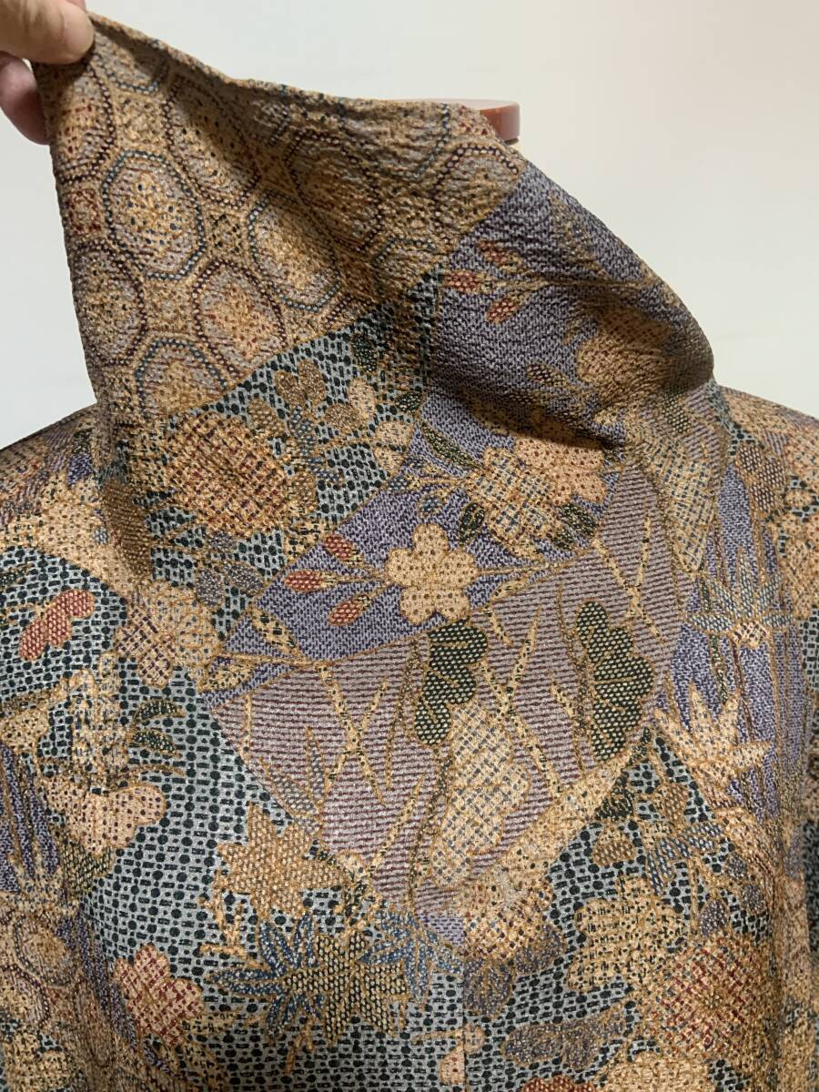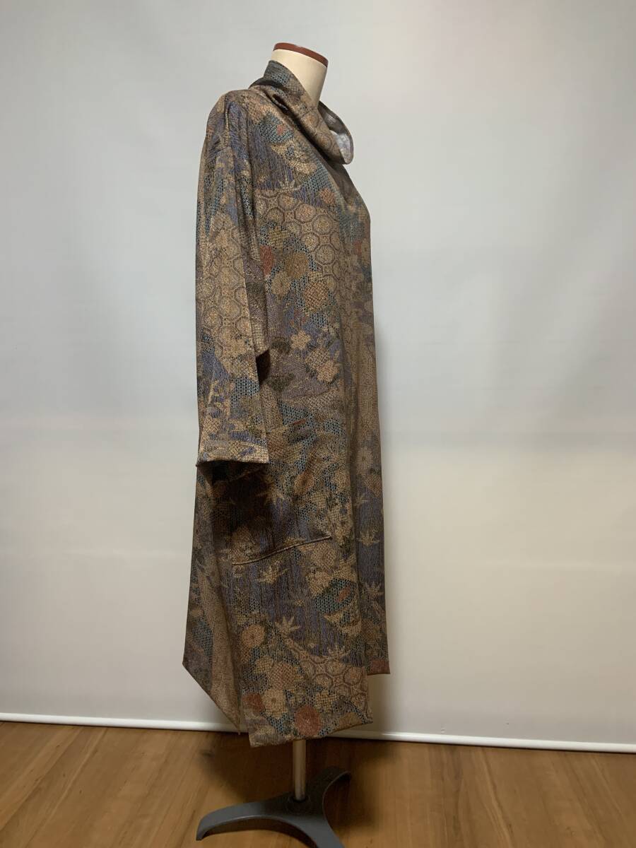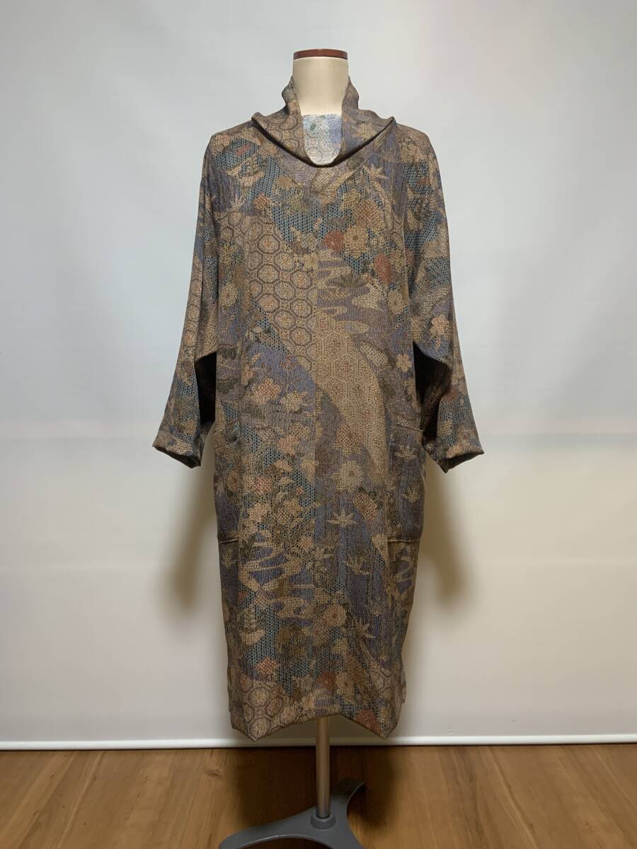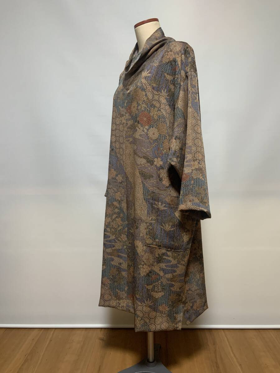 着物リメイク ワンピース ポケット付き オフタートル ドロップショルダー 長袖 縮緬 花柄 茶系 小紋 V059