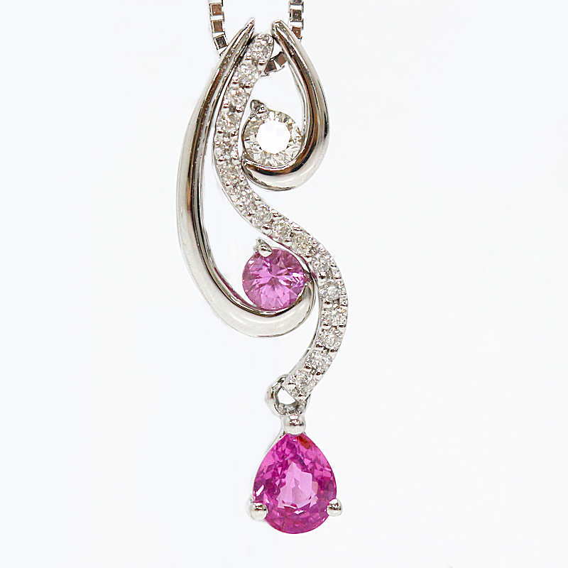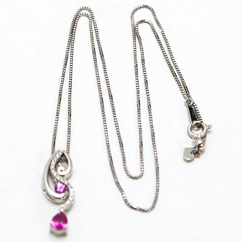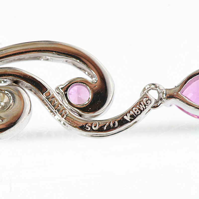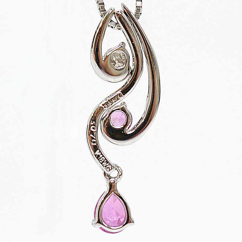 | コメント | 曲線が美しいピンクサファイヤとダイヤモンドが輝くネックレスです。 長さの違うカーブが3つ合わさり雫のような形とゆらゆら揺れるピンクサファイアのデザインがとてもおしゃれです。 また、素材にホワイトゴールドが使われているため、地金積立にもおすすめです。 中古品ですが、キズや汚れ等はあまりなく綺麗な状態です。この機会にいかがでしょうか? |
