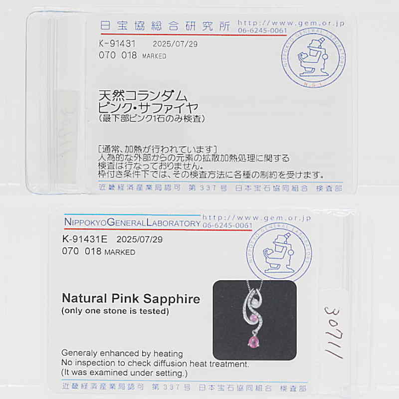 | 宝石名 | ピンクサファイヤ《0.70ct》、ダイヤモンド《0.18ct》 |