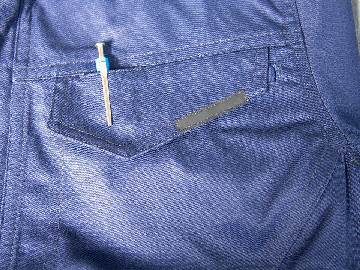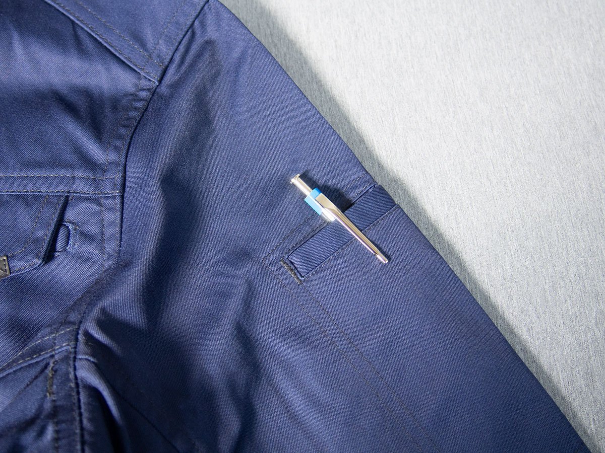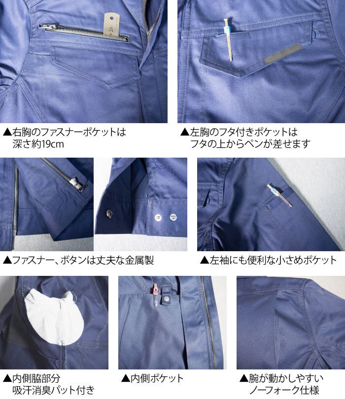 | 仕様 | フロント:ファスナー仕様 バック:ノーフォーク仕様 バック裾部:タブベルト付き(金属ボタン) 袖口:金属ボタン仕様 脇部:吸汗消臭パット付き 右胸:短めのペン差しの付いたフタ付きポケットと深さ約19cmのファスナー付きポケット 左胸:フタの上からペンが差せるポケット、フタの下に約2.5cmのループ付き 左袖:小さめのペン差しポケット ※左右脇にも通常のポケット、内側にもポケットがあり、ポケットは計7つ |