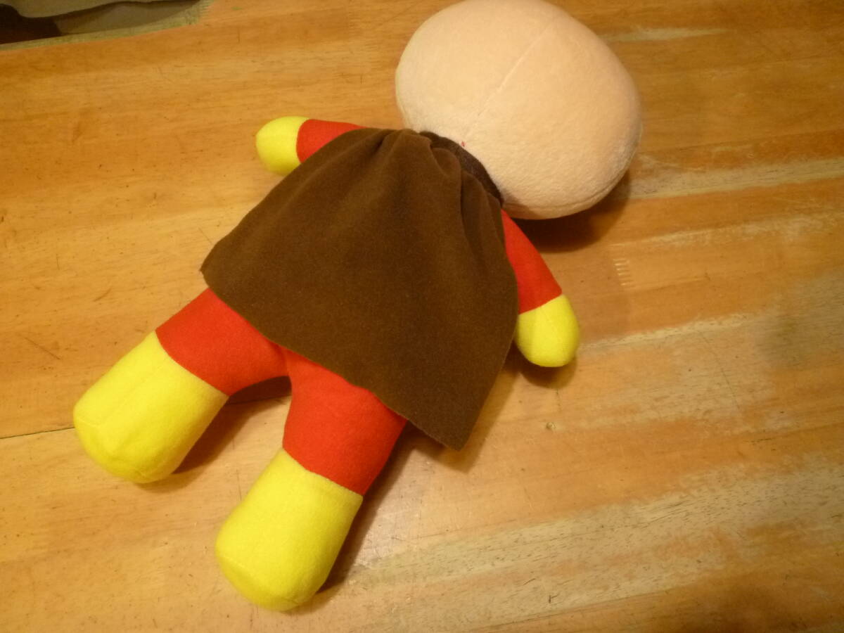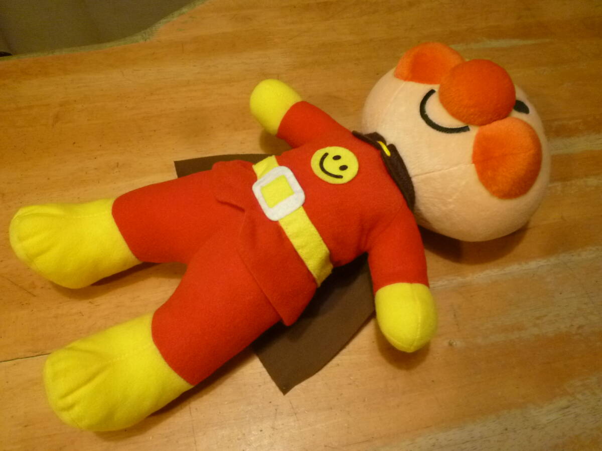 こちらは小さなお子様が大好きなアンパンマンで、その改造アンパンマンのぬいぐるみです。当初腕や脚は金属製の駆動部が入ってお腹の電池により色々な動き等があった様ですが、全て機能しなくなった為取り除き、表面はそのままに内部に綿を入れ各部を改めて縫い付けぬいぐるみに変身させたものです。