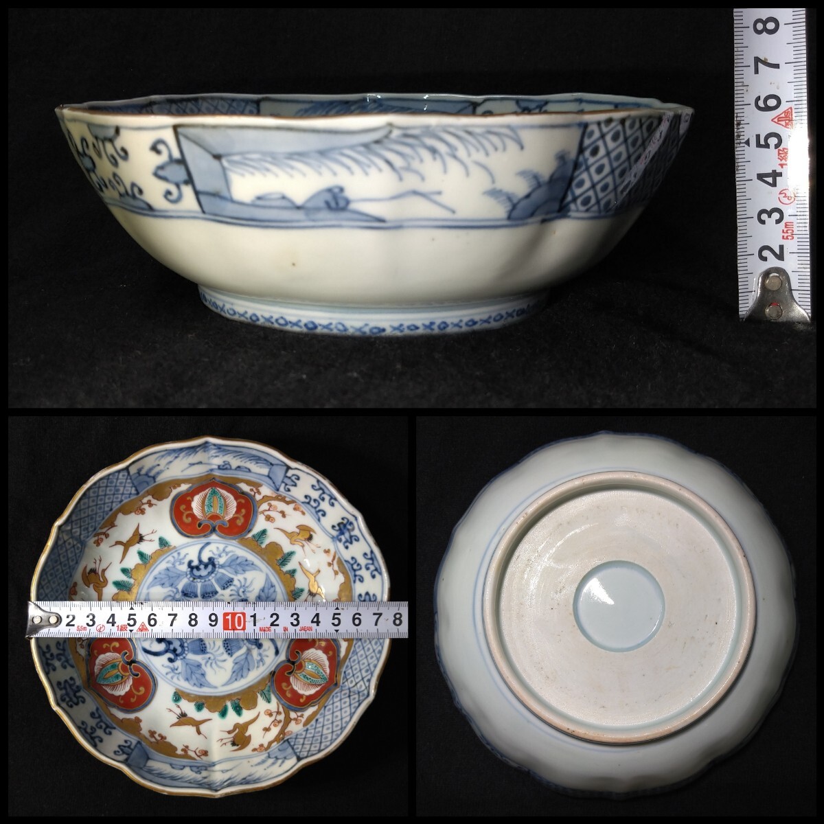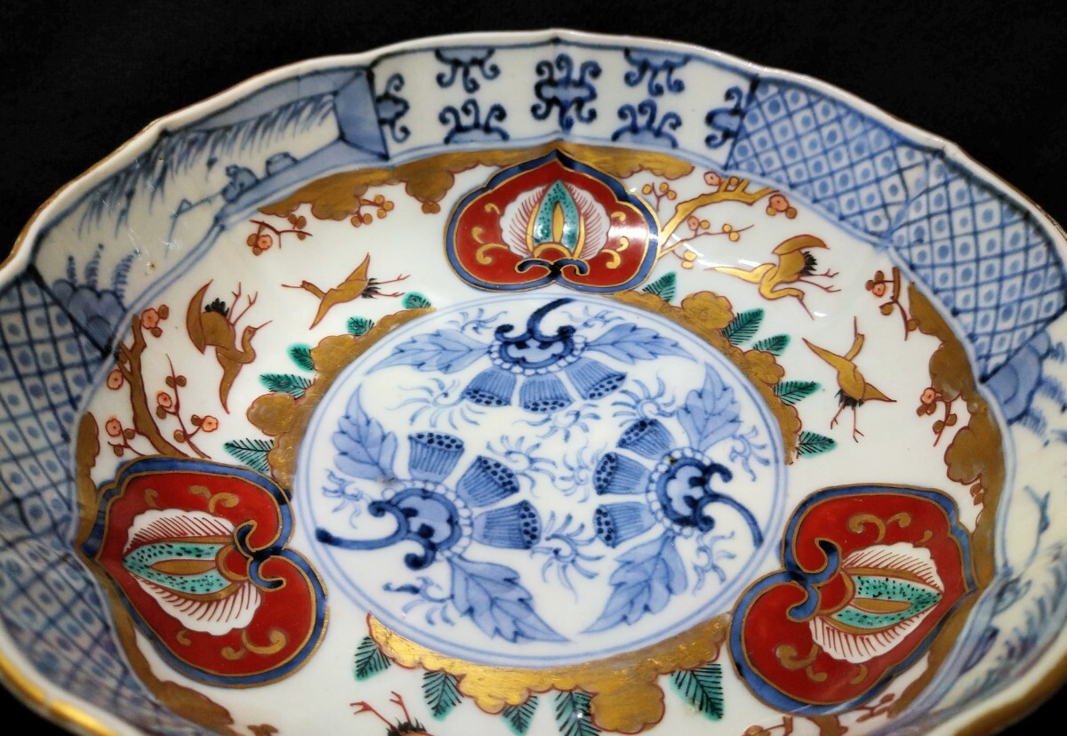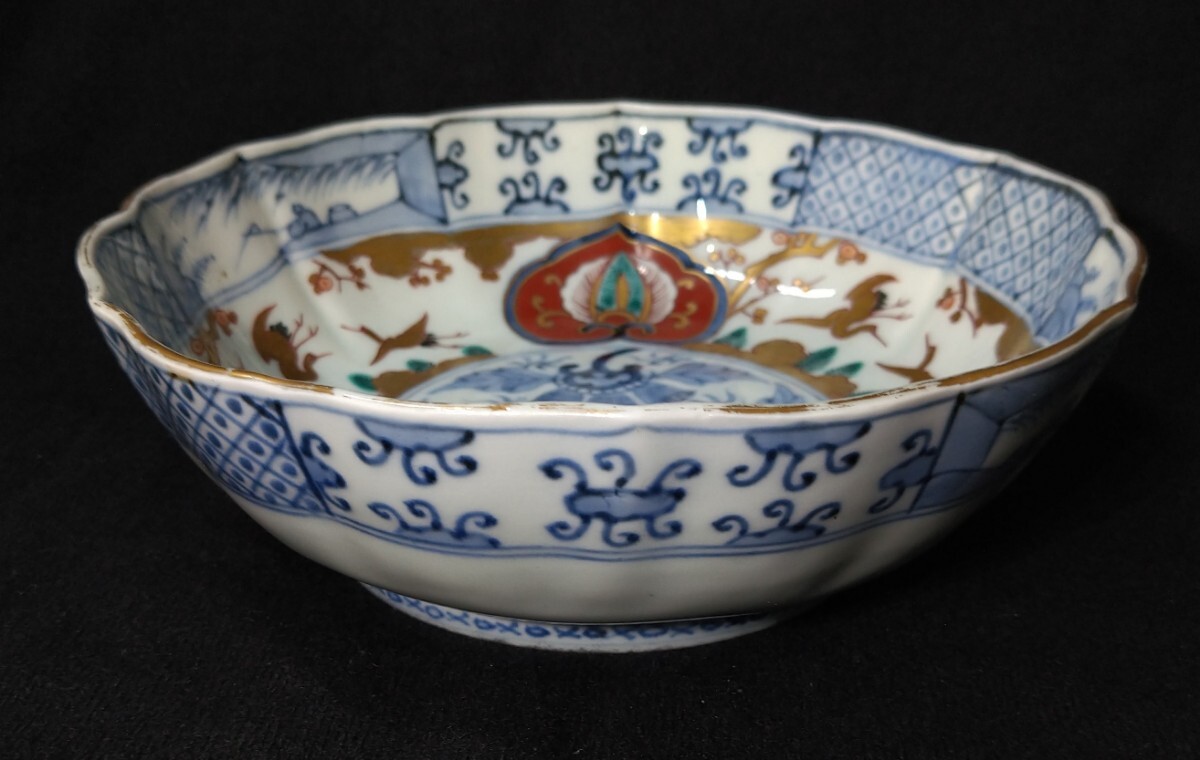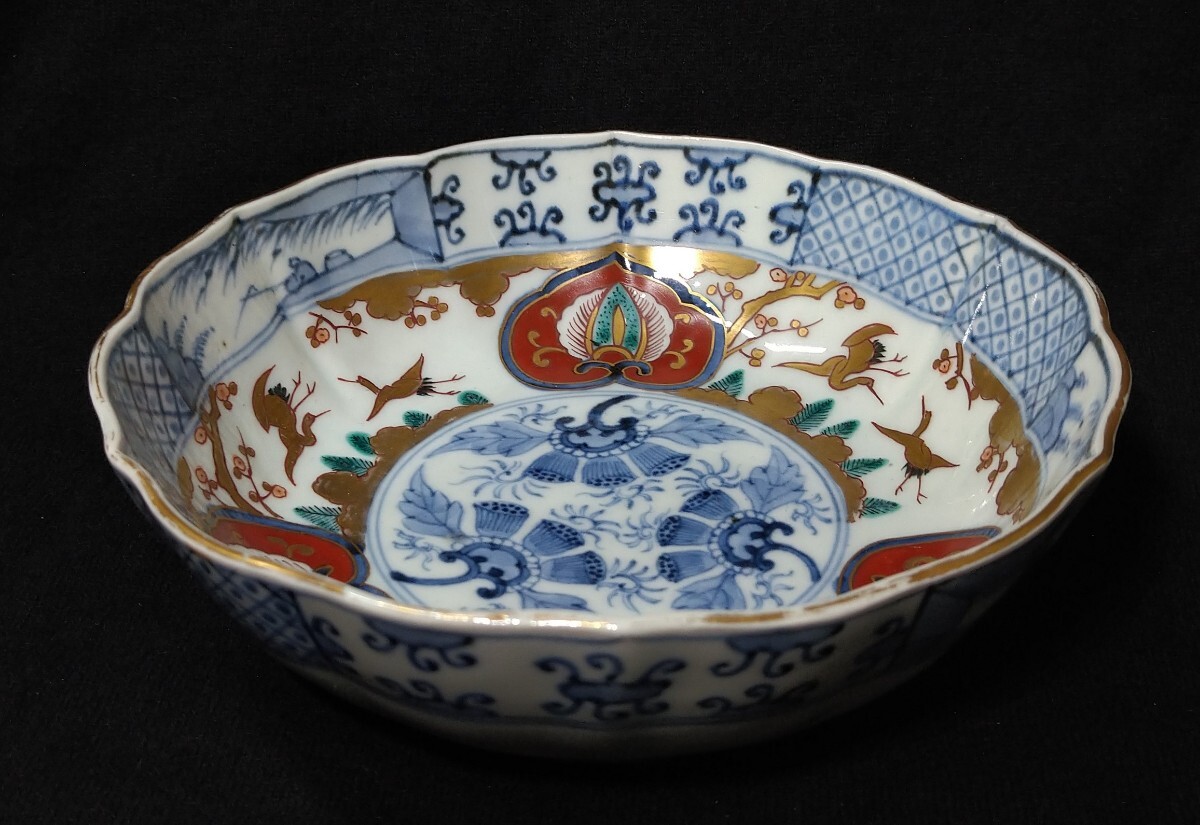 松に鶴が優雅に描かれた、美しい金彩が目を惹く深鉢でございます。素人採寸で申し訳ございませんが、径18.0cm、高さ5.9cmでございます。