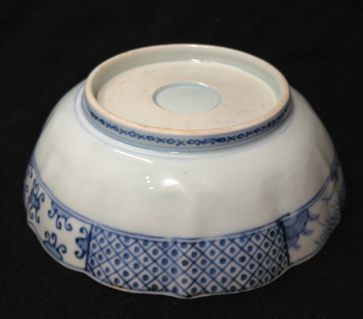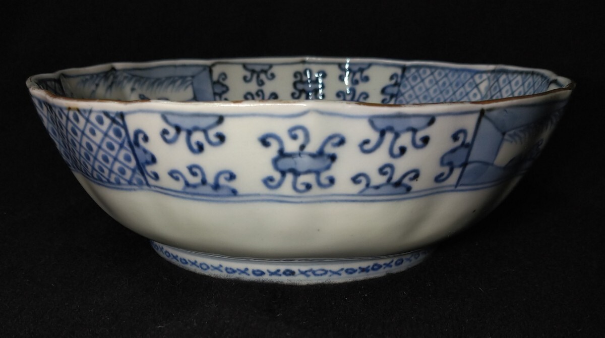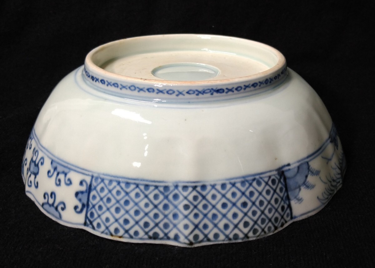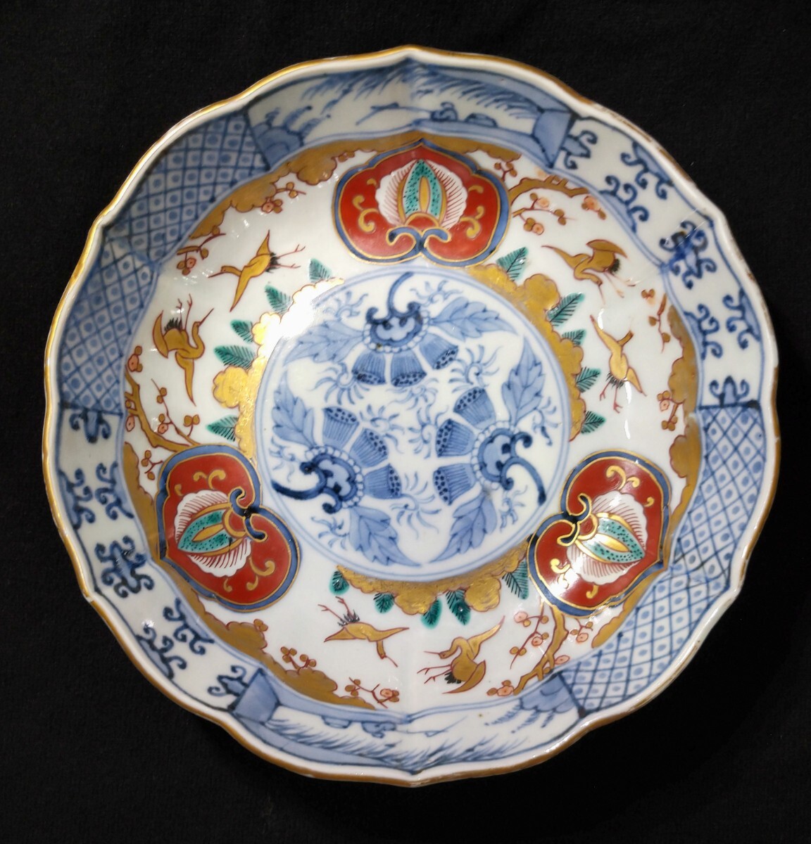 松に鶴が優雅に描かれた、美しい金彩が目を惹く深鉢でございます。素人採寸で申し訳ございませんが、径18.0cm、高さ5.9cmでございます。