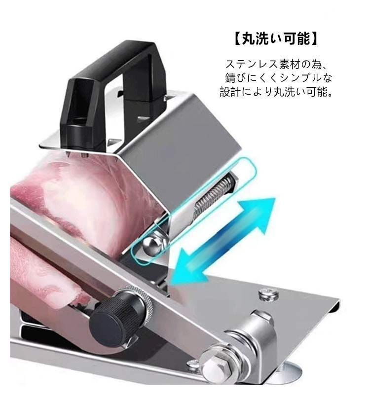 【異なる厚さの肉をカット】ノブを少し回すだけで、肉の厚さを調整できます。操作もお手入れも簡単です。