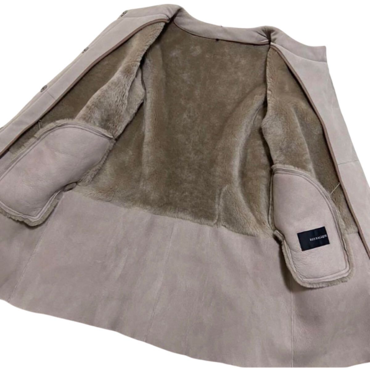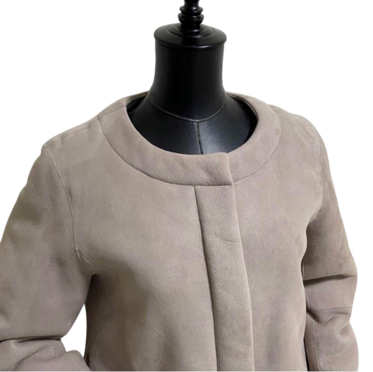 レラリックのノーカラーリアルムートンレザーコート。完売品。参考定価35万。選び抜かれた羊革をマットファブリックに。裏表どちらも羊革のダブルフェイスで素材の一体感も。最高峰の保温性と防寒性。この厚みでウールのような軽さを実現。さらにシアリング仕上げをドッキングデザイン。スイッチマテリアルのメリハリ。フェミニンな雰囲気もプラス。