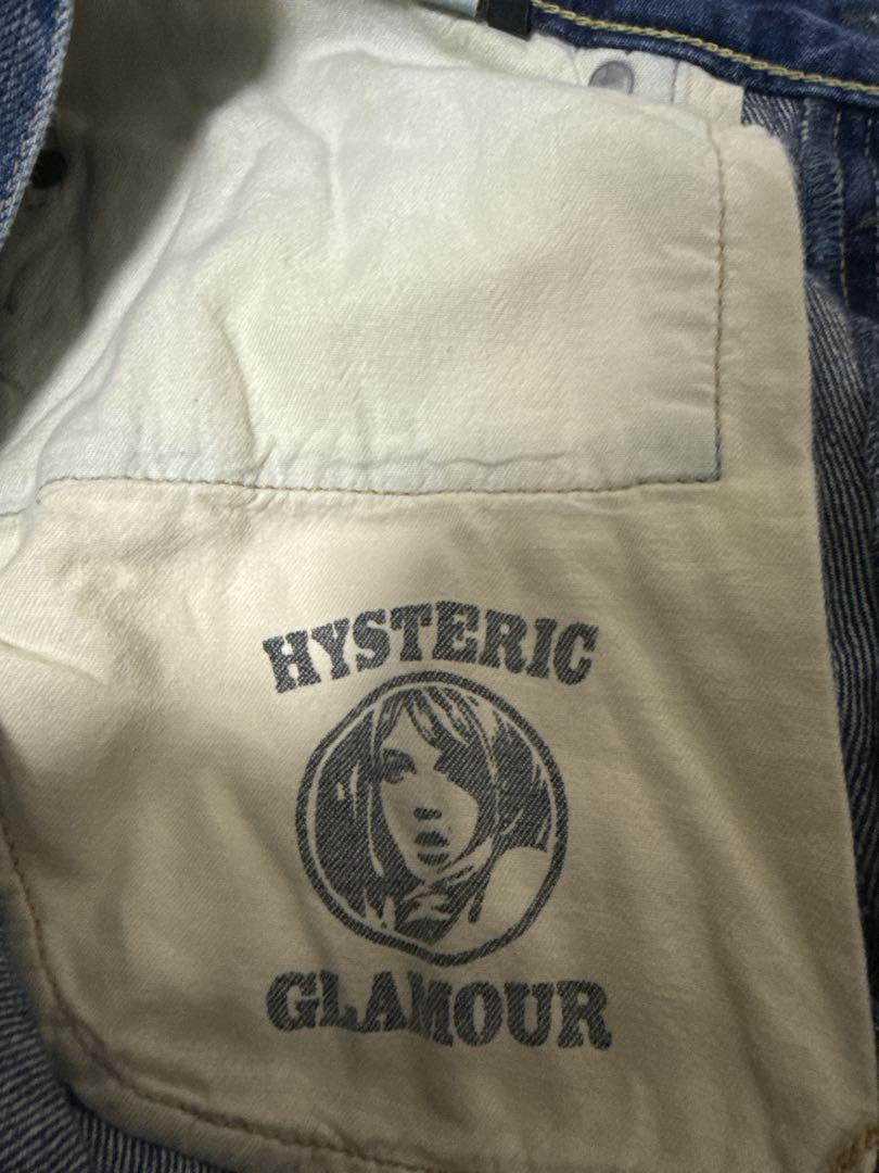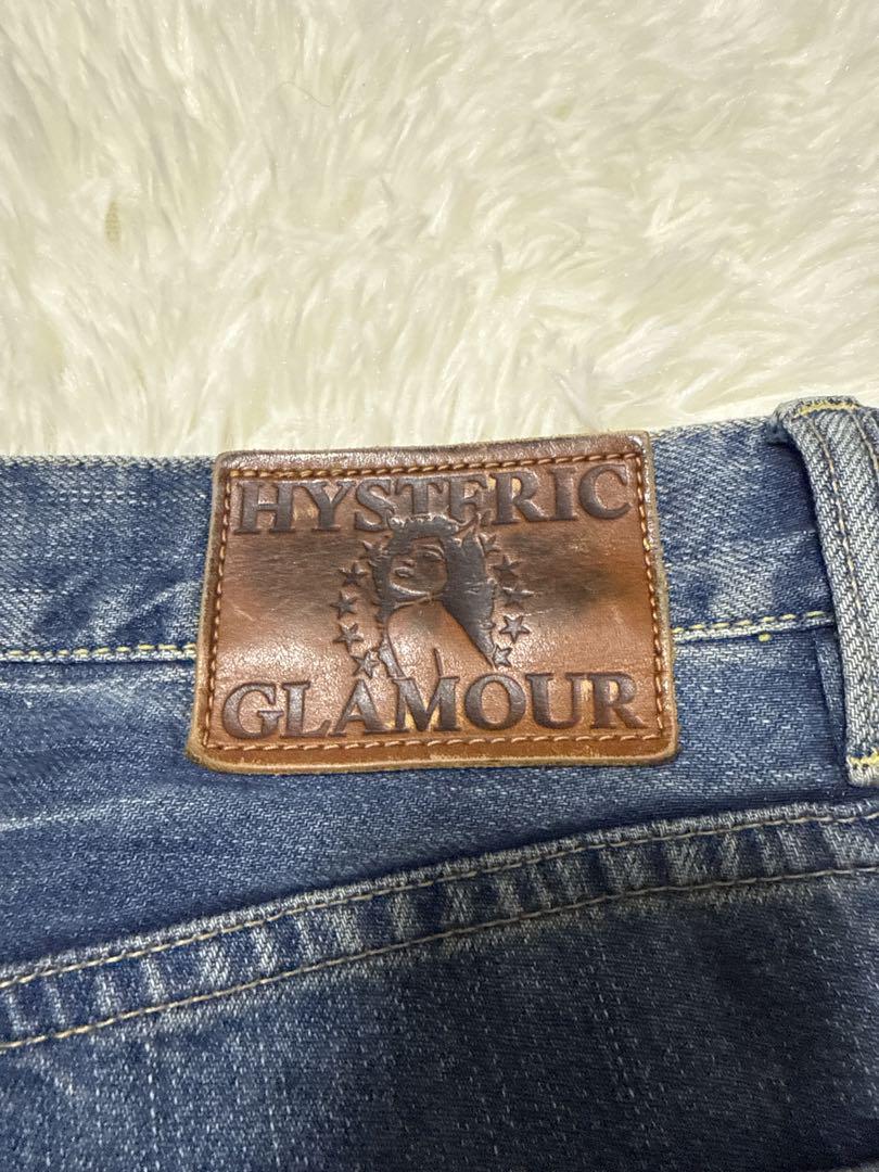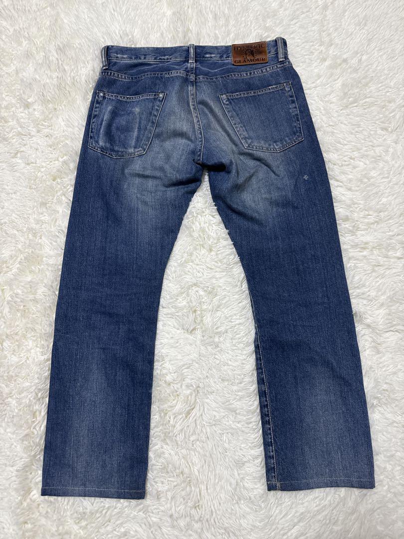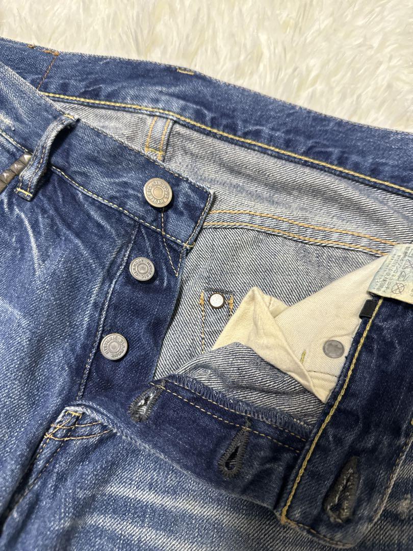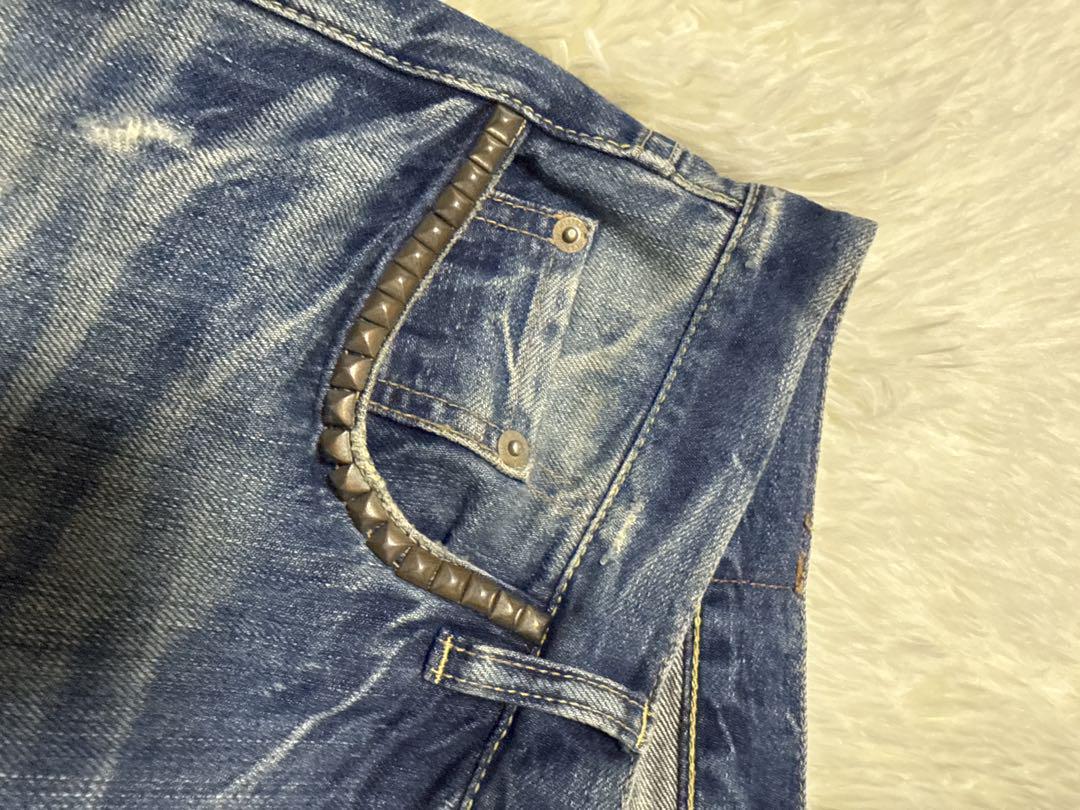 右足に大きなリペア・クラッシュ加工、左足にもリペア穴ありの存在感抜群な一本。ポケット縁にはスタッズ装飾も施され、ブランドらしいハードなデザインです。