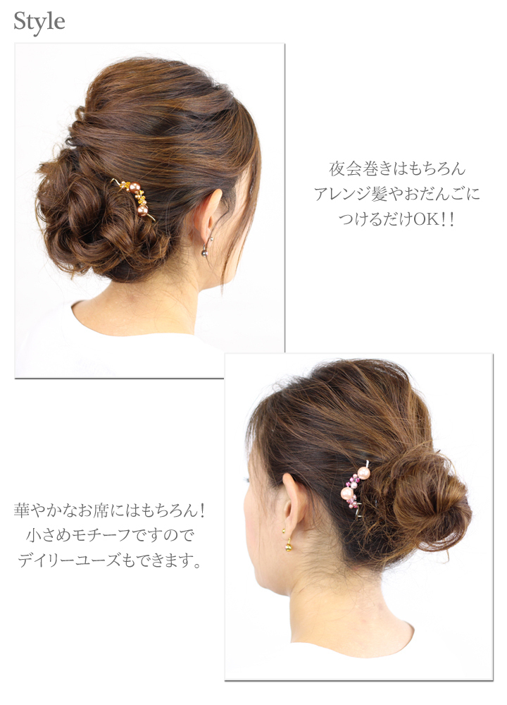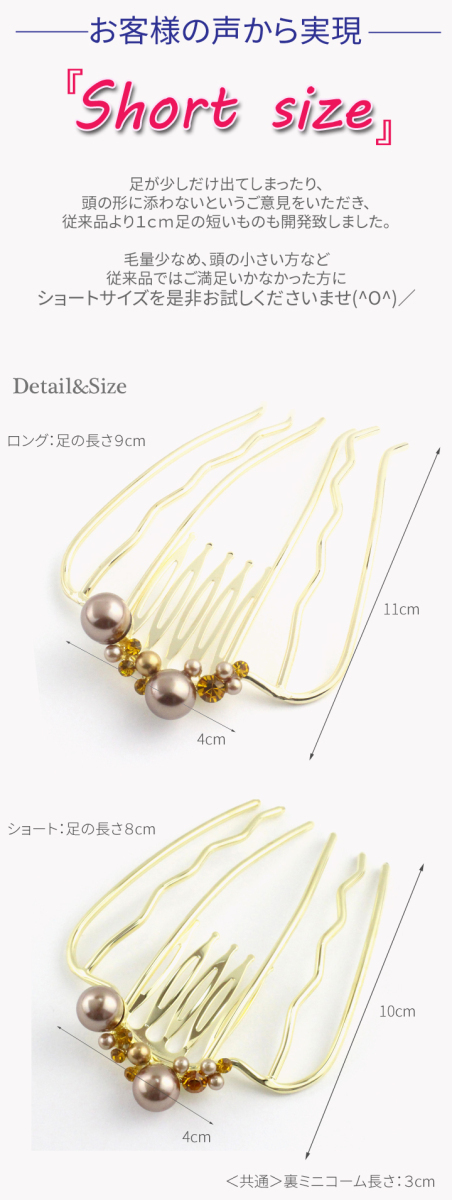 商品説明 | お客様の声から実現!『ショートサイズ』 足が少しだけ出てしまったり、頭の形に添わないというご意見をいただき、 従来品より1cm足の短いものも開発致しました。 毛量少なめの方や頭の小さい方など従来品ではご満足いかなかった方に ショートサイズを是非お試しいただきたいです(^O^)/ ◆日本特許取得済◆ 夜会巻きコームに新革命!!業界初の表裏ダブルコームでキープ力抜群!! 太めの長い6本足コームが全体をHOLDし、短いコームが付け根部分をHOLD コームをつけたときの嫌なツッパリ感などないため、長時間付けて居られる優れものです。 ひかえめな小粒パールとラインストーン!普段使いもでき幅広いシーンで活躍できます! |