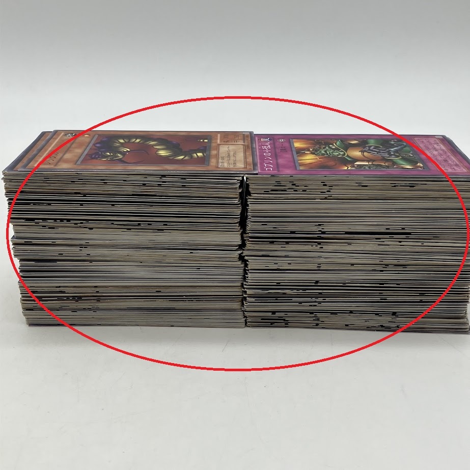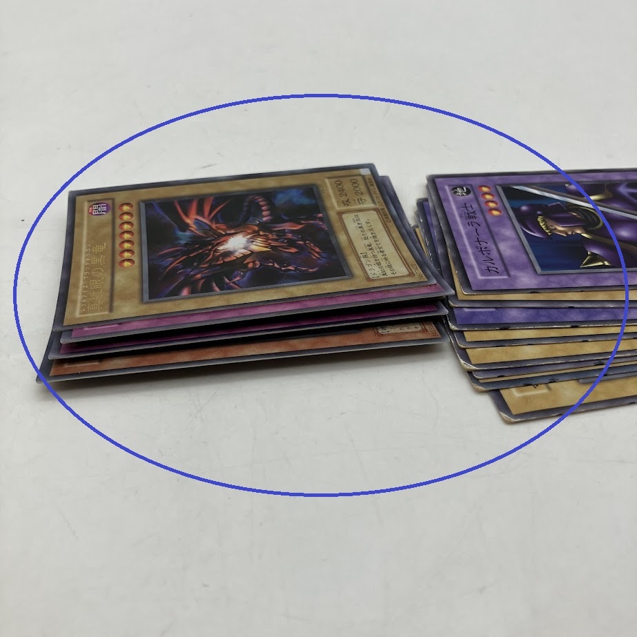初期のカードには特にダメージがあり、レアカードは歪みがあります。(画像青丸部分)
