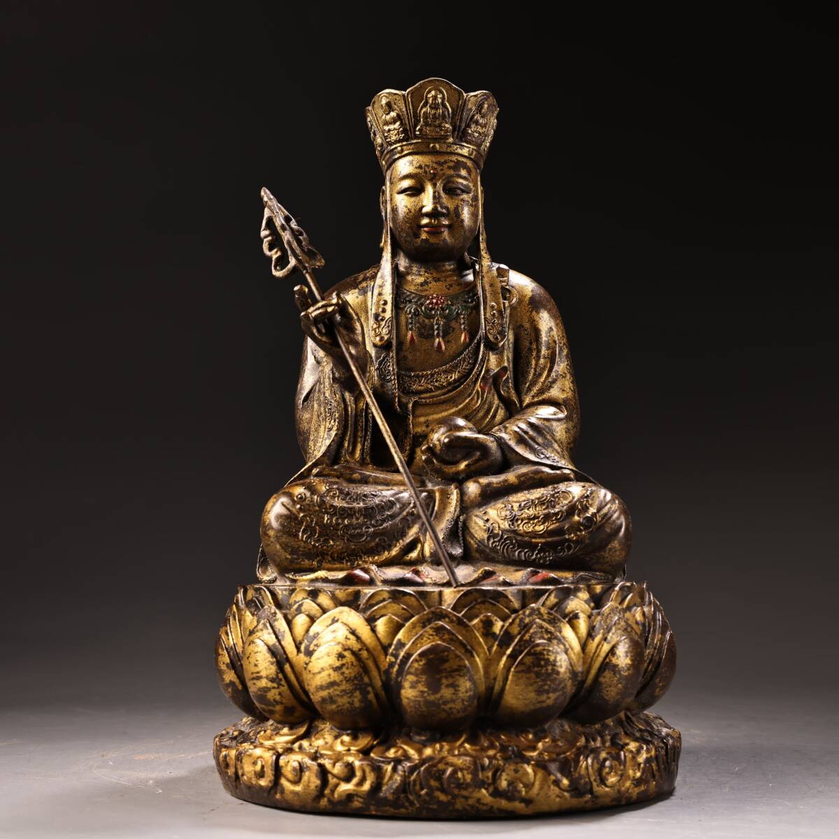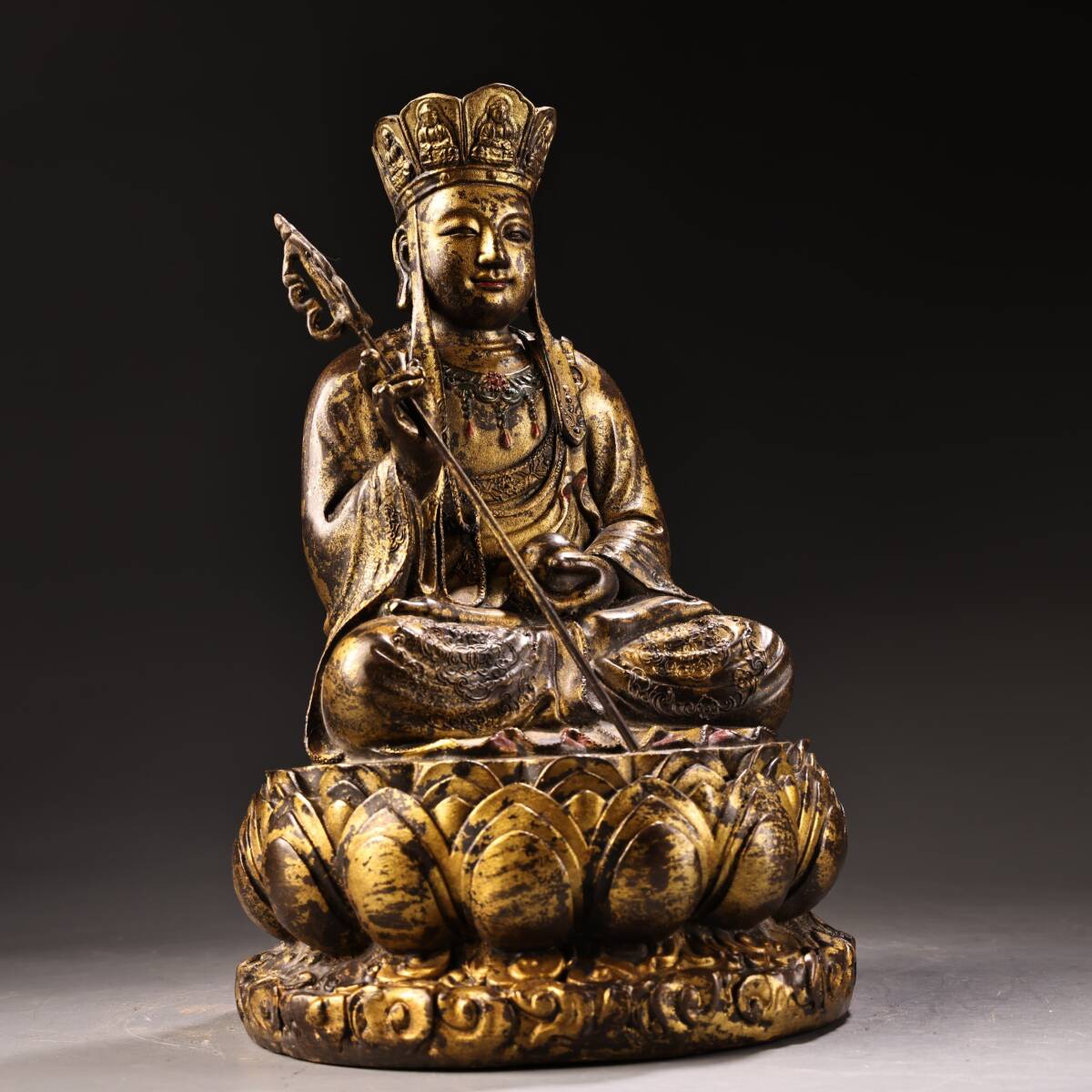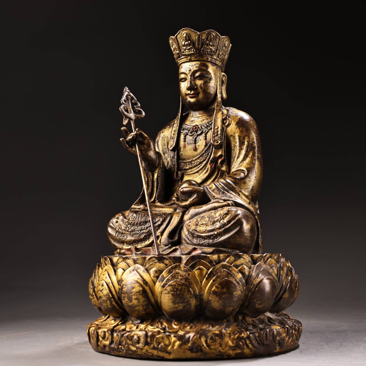 *珍品旧蔵* 清 乾隆年製 純銅 全銅 高浮彫鏨刻泥金 地蔵王菩薩 仏像 奉納されていた 供養品 銅製 銅器 極細工 唐物 中国古玩 骨董品 H48