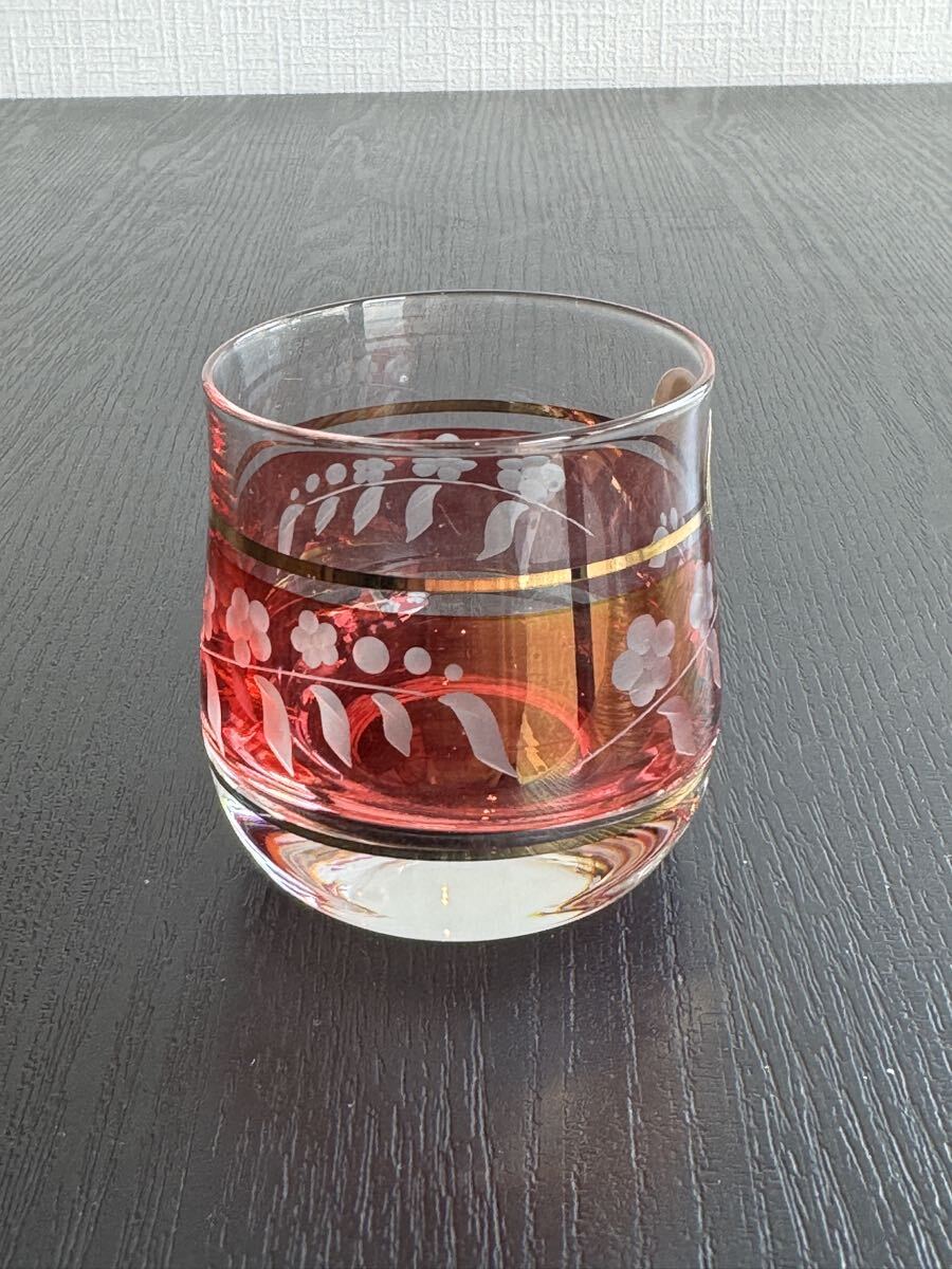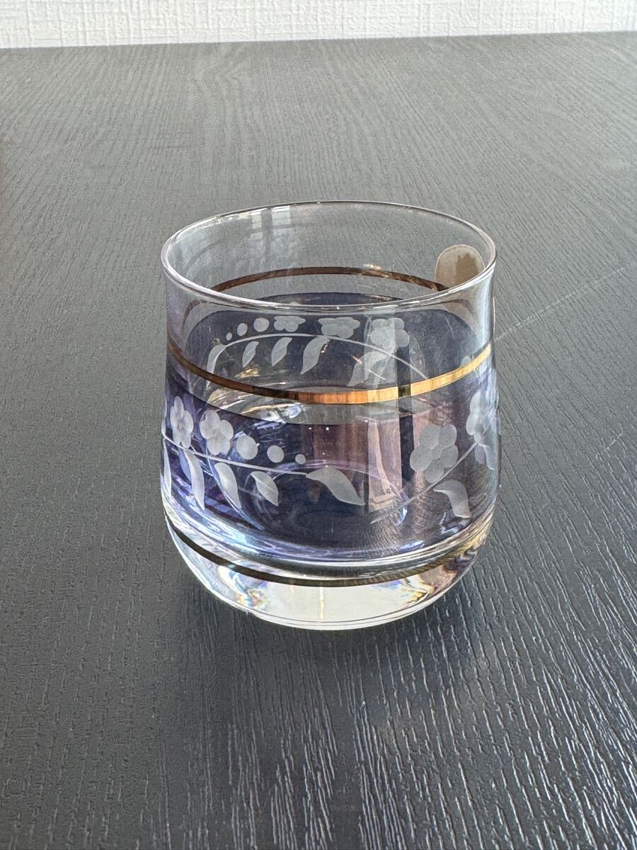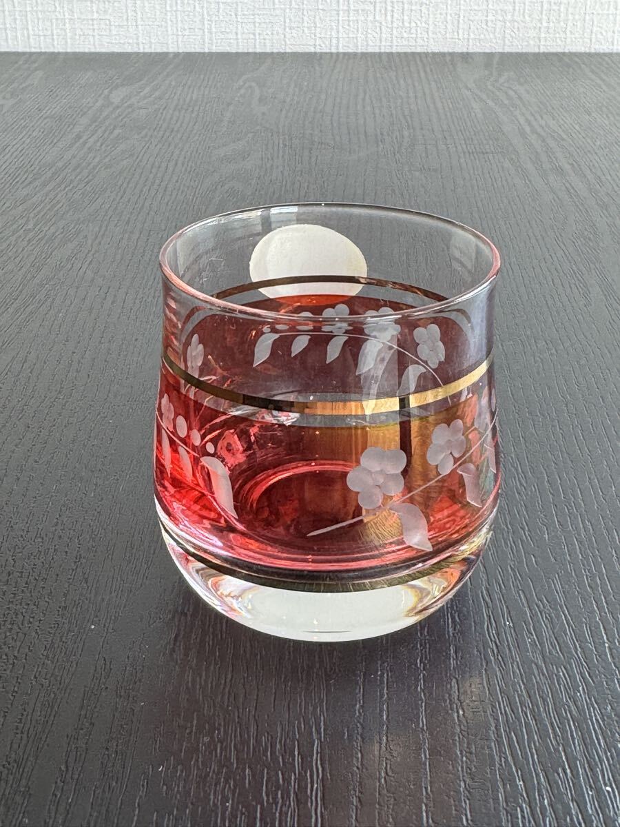 赤と青の被せガラスに葡萄文様のエッチングと金彩が施された上品なデザインで、テーブルを華やかに演出します。