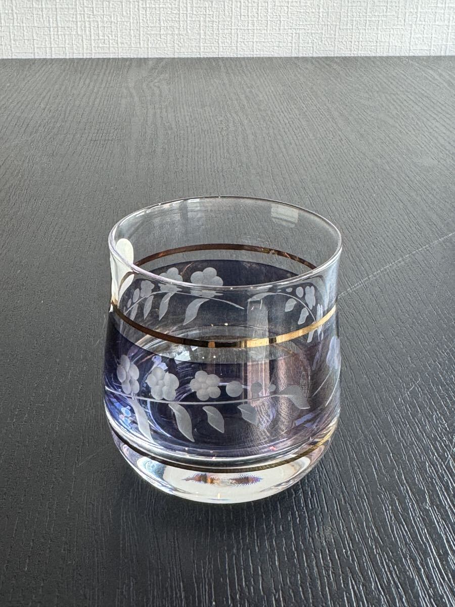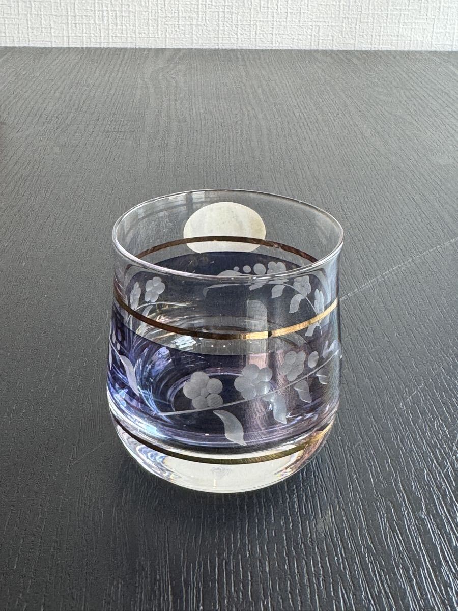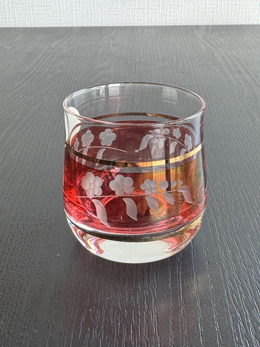 赤と青の被せガラスに葡萄文様のエッチングと金彩が施された上品なデザインで、テーブルを華やかに演出します。