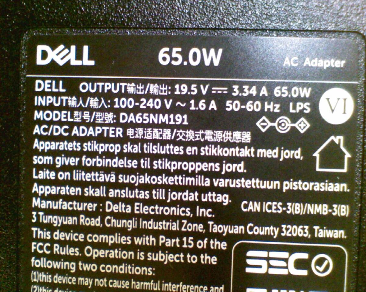 DELL 純正 65W 19.5V3.34A ACアダプタ- DA65NM191 /丸ピン4.5㎜コネクタ-