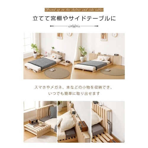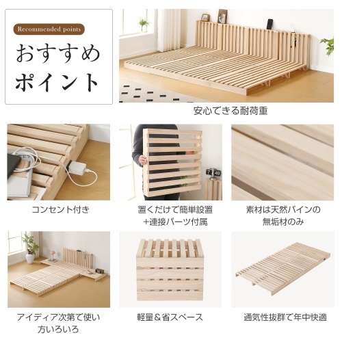 • 並べたっり、重ねたり自由にレイアウトことで生活に合わせて使用できるパレットベッドです。おすすめポイント:アイディア次第で使い方いろいろ;置くだけで簡単設置+連接パーツ付属;素材は天然パインの無垢材のみ;コンセント付き;軽量&省スペース;通気性抜群で年中快適;安心できる耐荷重150kg
