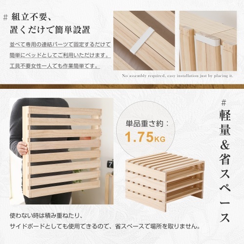 • 【組立不要、置くだけで簡単設置】並べて専用の連結パーツで固定するだけで簡単にベッドとしてご利用いただけます。工具不要女性一人でも作業簡単です。