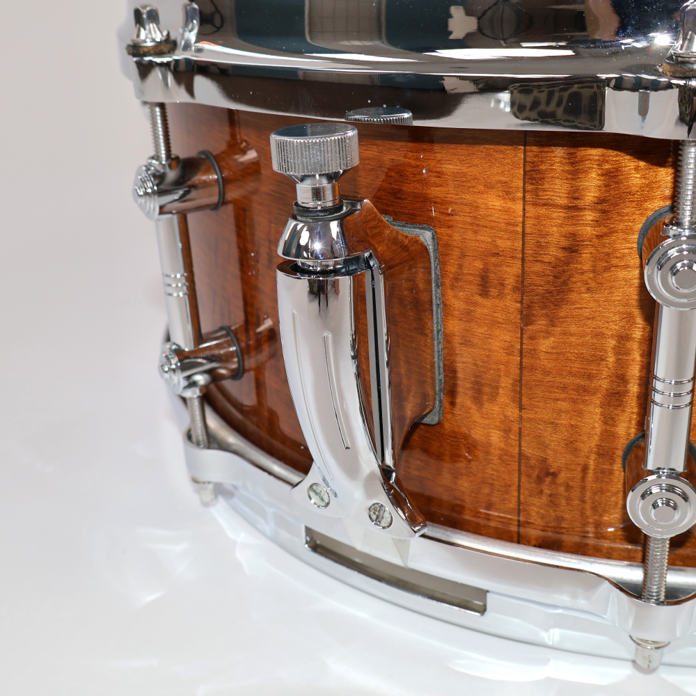 「RB125-55148S-AM」はエキゾチックなカーリーメイプルのカバリングが施された見た目にも美しいスネアドラムです。