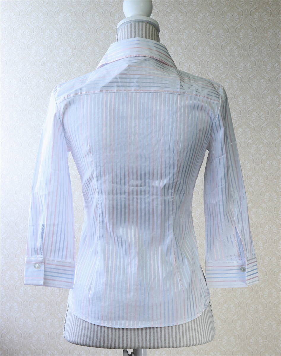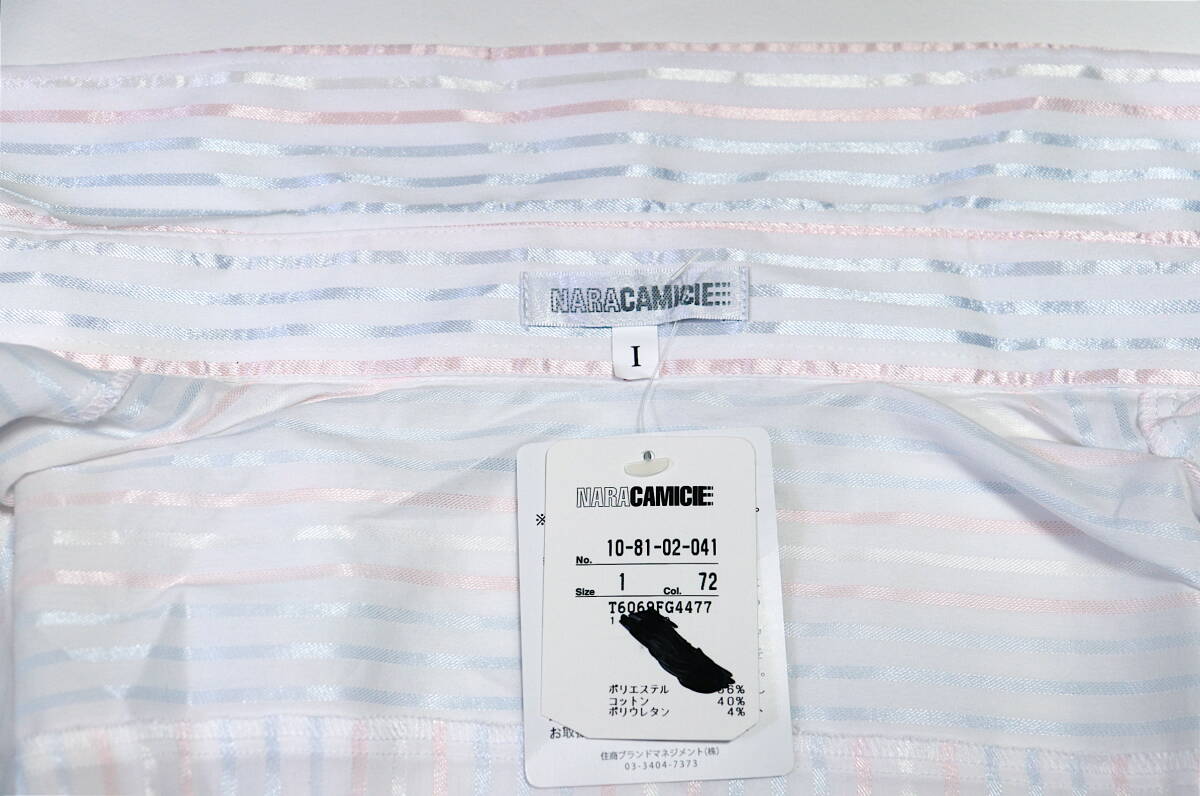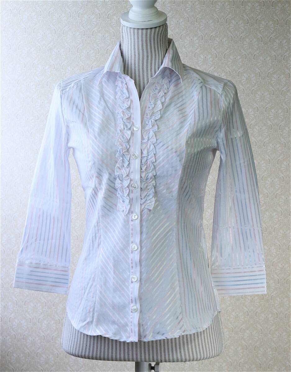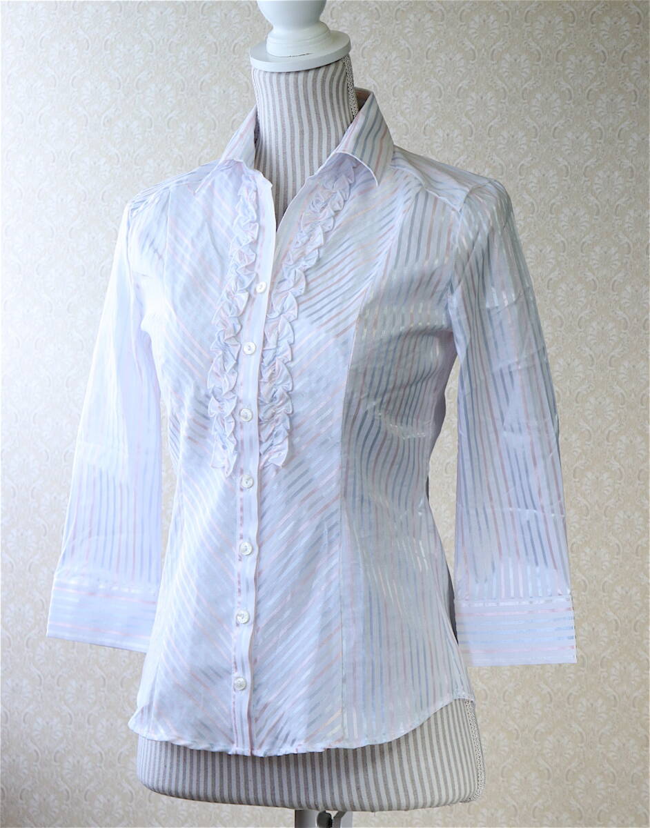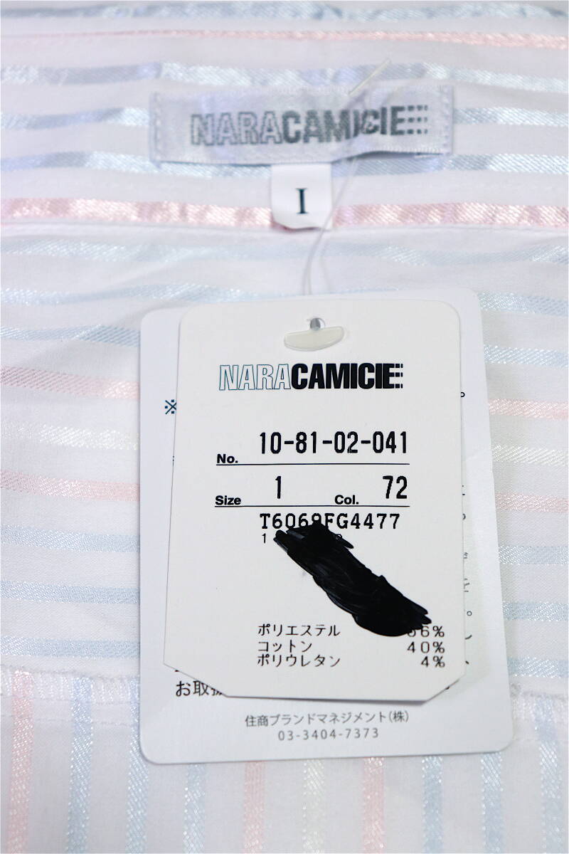 【タグ付未使用】M【送料185円】ナラカミーチェ 七分丈 前立 フリル ブラウス シルバー ストライプ シャツ 新品 美品 【クリックポスト】