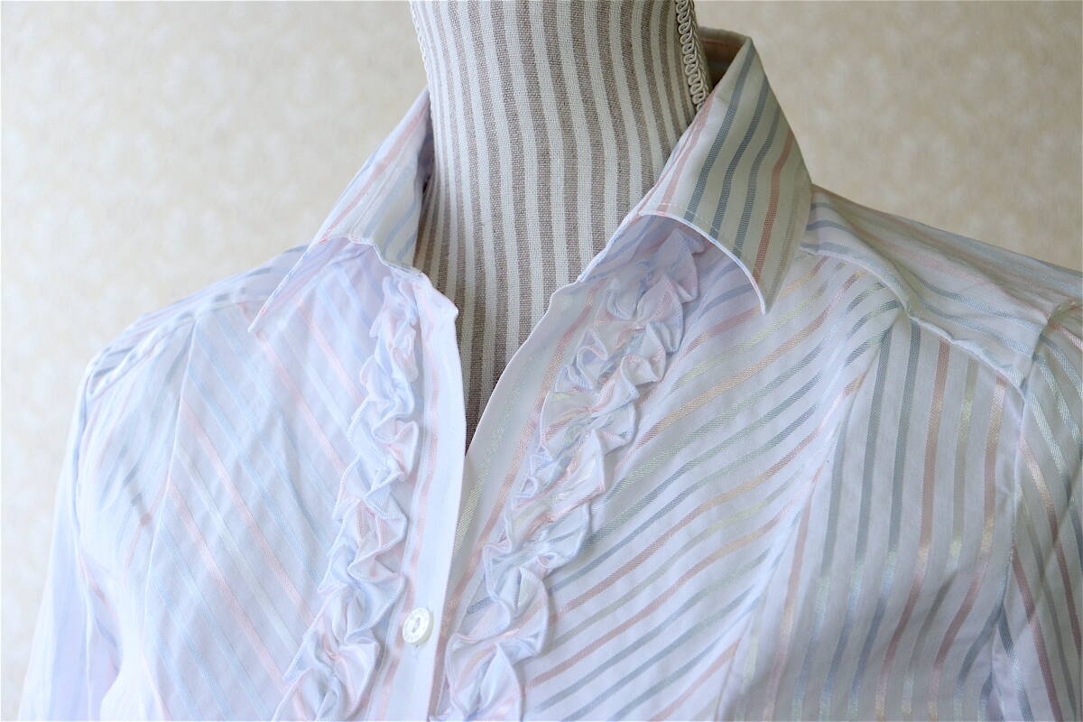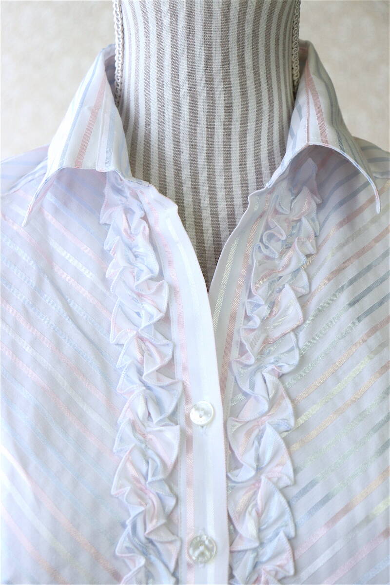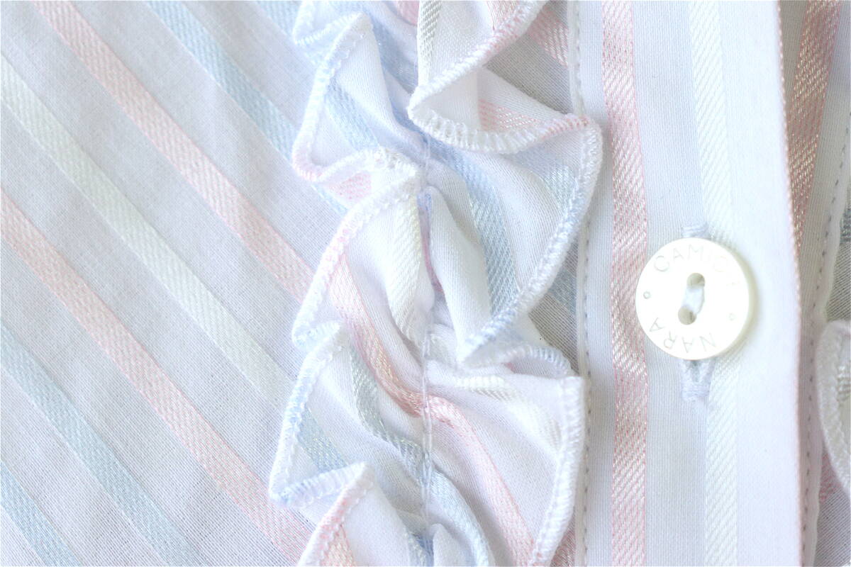 ナラカミーチェ定番のフリルブラウス。白と上品な光沢のあるシルバーのストライプ。