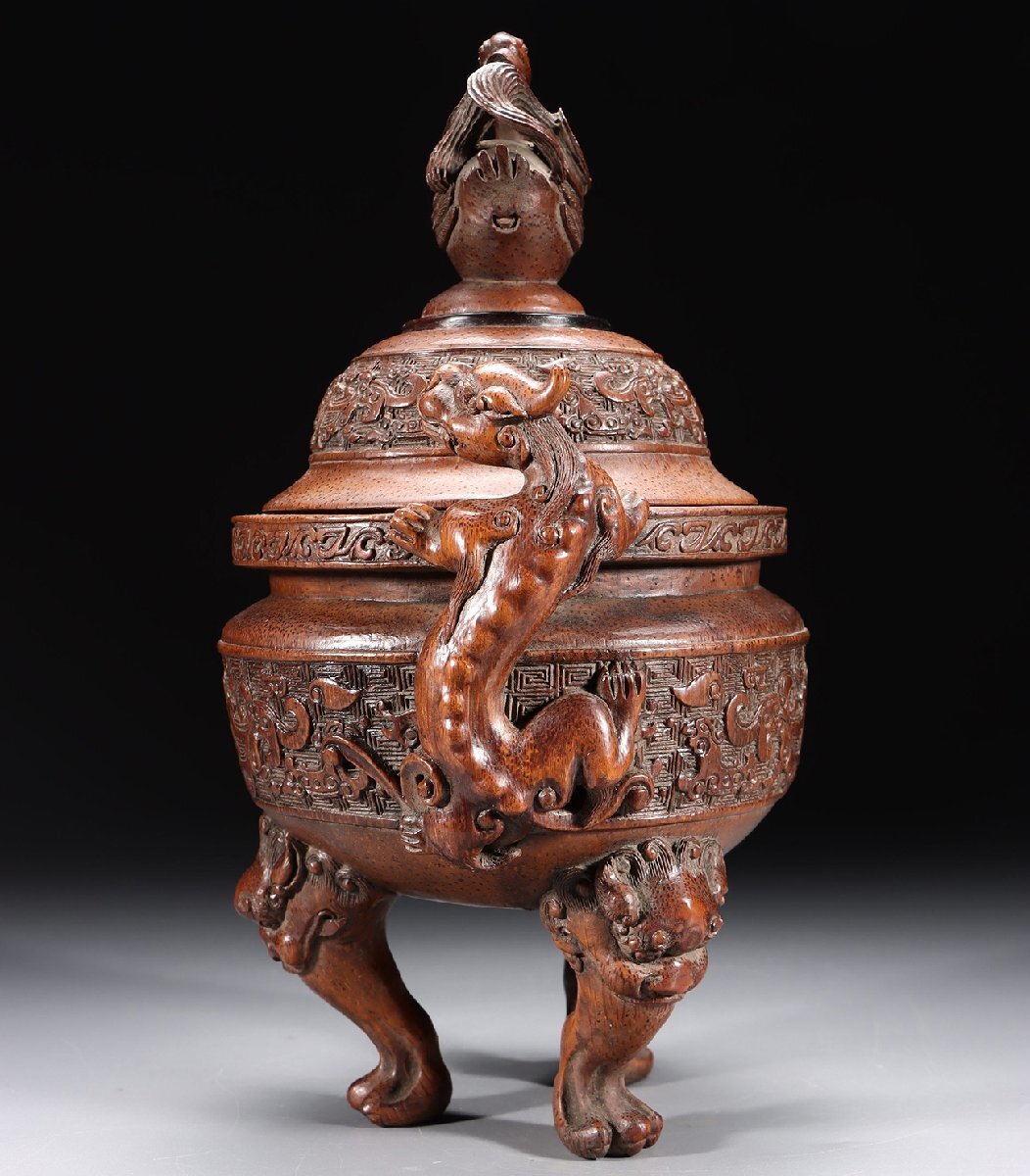 【安】清時代 竹彫 獣耳天鵞鈕三足香薫炉 極細工 古置物 古擺件 中国古美術 古美味 時代物 古董品 295 サイズ(約寸) |
