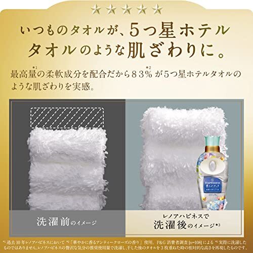 | 商品説明 | 5つ星ホテル推奨!新レノアハピネス夢ふわタッチで香りも肌ざわりも5つ星。大改良したレノアハピネス夢ふわタッチでおうちにいながら5つ星ホテルの贅沢を体験してください。 特徴は「極上*の香り」と「5つ星ホテルタオルのような肌ざわり」(*レノアハピネス史上) 最高量*1の柔軟成分を配合しているから、5つ星ホテルタオルのような肌ざわりを83%が実感*2しています。(*1 過去10年レノアハピネスにおいて、*2 「華やかに香るアンティークローズの香り」使用。P&G消費者調査[n=108]による) 1週間長続きする*贅沢な香り。レノアハピネス夢ふわタッチなら5つ星ホテルも認める贅沢な香りが1週間楽しめます。(*保管状態にて) みずみずしく香るパステルフローラル。風にそよぐミュゲとジャスミンとグリーンアップルの重なり合う香りのシンフォニーで、みずみずしい気分に包まれます。