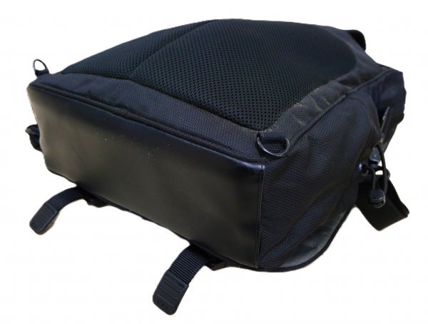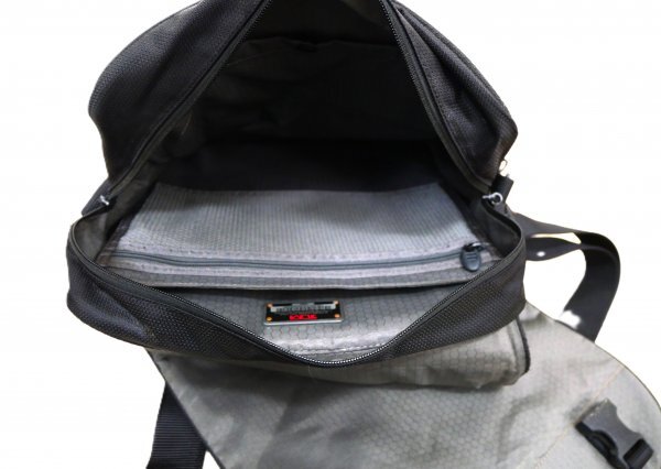 前ポケット1か所、バックルを開閉するとポケット2か所とペン入れ、カード入れ、さらにファスナーを開閉すると内ポケット2か所と仕切りが1か所ついています。両横にポケット1か所ずつついています。前下に白い汚れ、持ち手にスレ、横のポケットの一つ端に3㎝ほど縫い目のほつれがあります。うしろポケット1か所ついており、リュックのひもを収納できます。