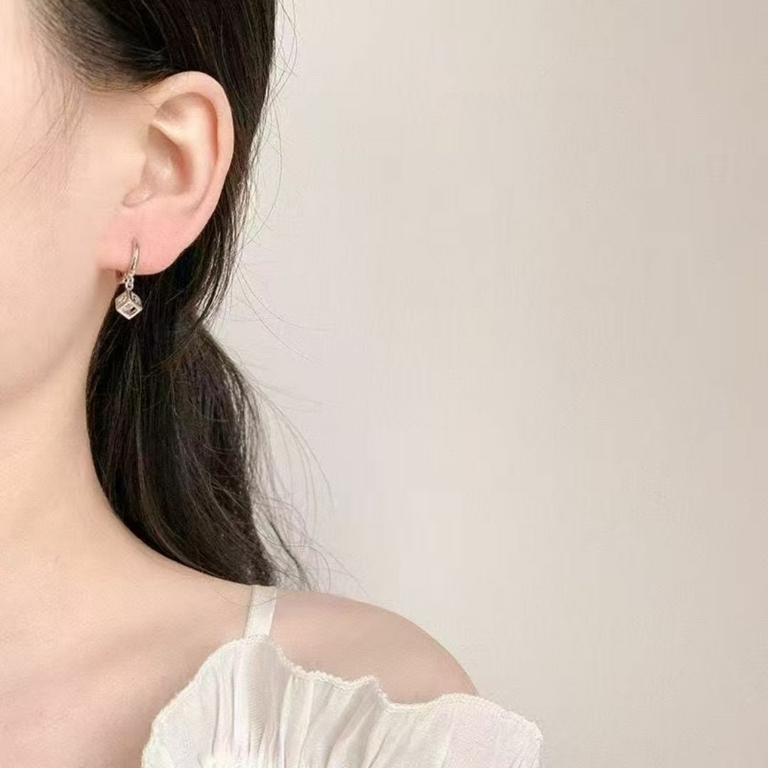 オープンな立方体の中にキラキラしたかわいいデザインのピアス。