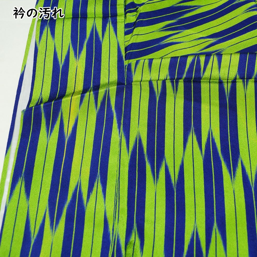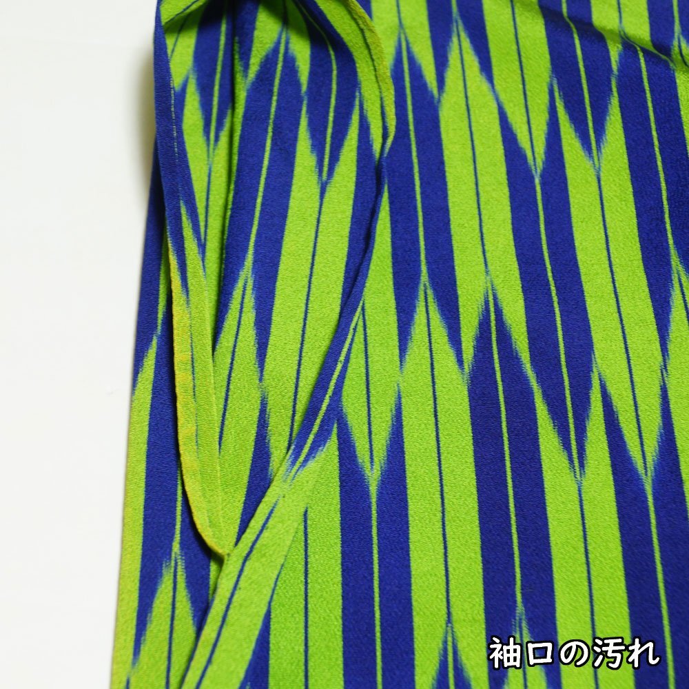 | 商品説明 | 明るい蛍光黄緑色系の地に、矢羽根模様が施された単衣のお召しです。 |