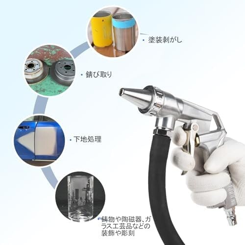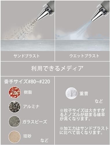ウエットブラスト:湿式ブラストにも対応します。<br>例えば、重曹を研磨材としてウエットブラストでサビ除去作業ができます。<br>重曹ブラストは準備が簡単、傷つけずに研磨できて、汚れやサビがよく落ちてくれます。<br>説明書を読めば初心者でも簡単に使えます。<br>※使用前に、説明書をよく読み、安全に正しく使用してください。<br>