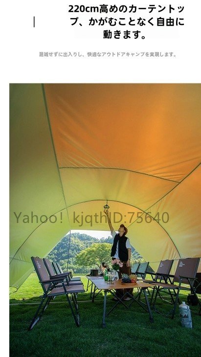 【進化したトンネル型デザイン】トンネル型の設計により、防風性と防雨性を高めながら、夏の日差しを360度カットし、快適なシェード空間を提供します。広い開口部から風が通りやすく、自然な換気でタープ内の温度を快適に保ちます。8~16人がゆったり過ごせる大容量スペースと十分な高さで、家族やグループでのアウトドアにぴったりです。
