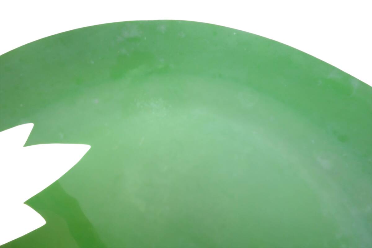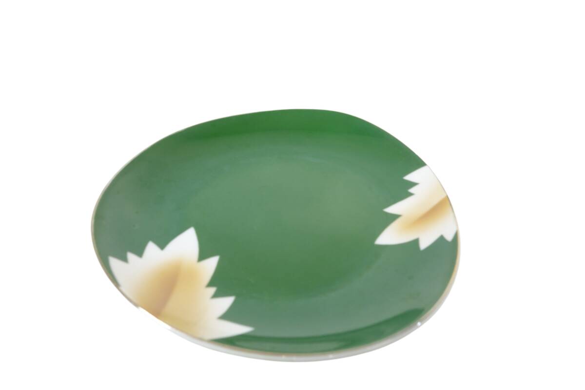 濃いグリーンの地色に、抽象的な花のような白×ベージュの模様が描かれた、非常にモダンで印象的なデザイン。
