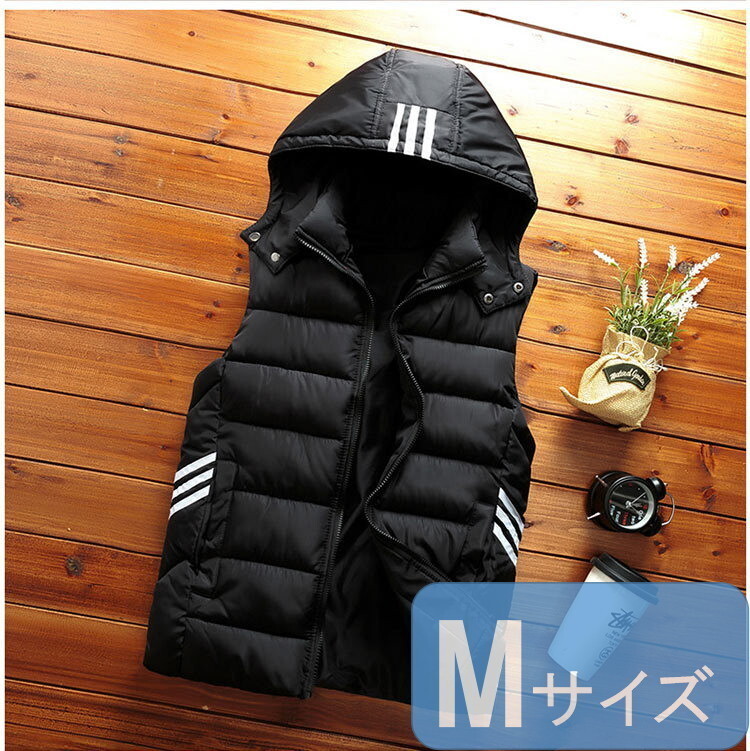 フードが取り外せる メンズ ダウンベスト 999 ブラック Mサイズ 中綿ダウン 中綿ベスト キルティング アウター 防寒 秋冬 暖かい