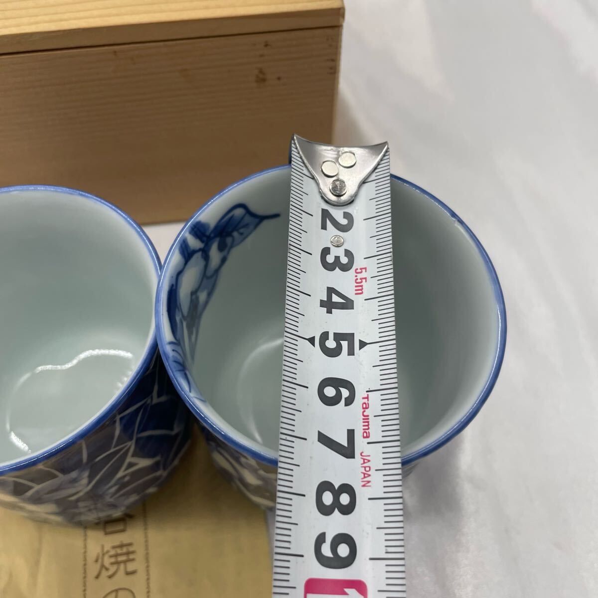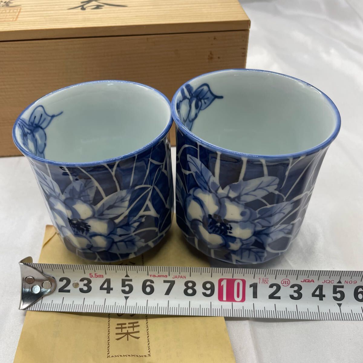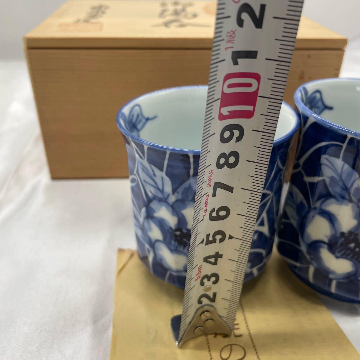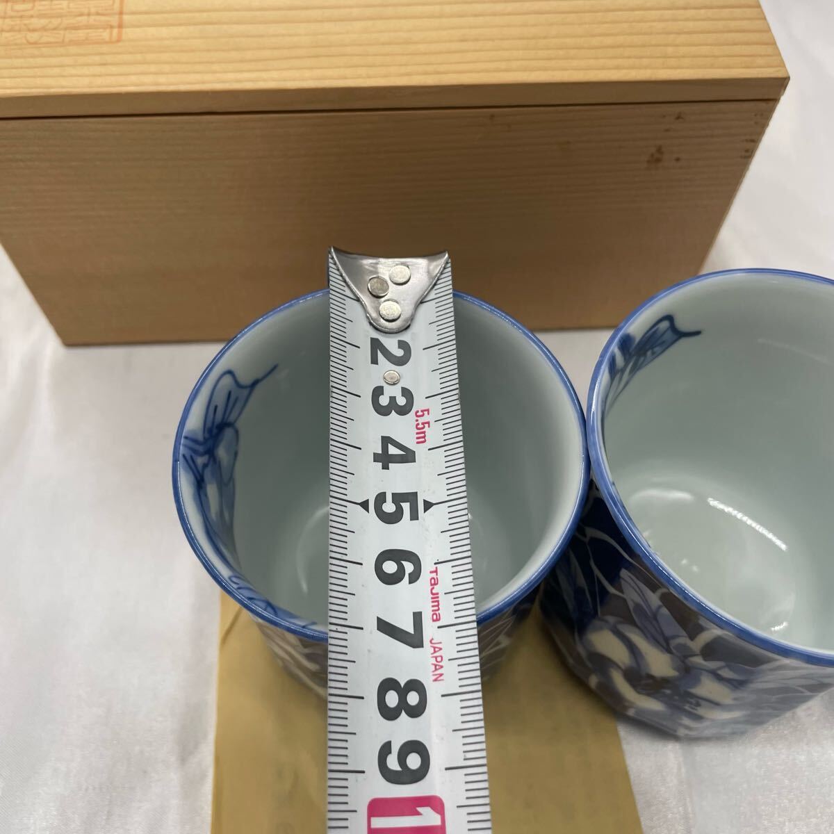 【菖水】美品 夫婦湯呑 染付 花文様 共箱付 茶器 2客セット 木箱付き 和食器 ペア 煎茶道具 お茶 おもてなし 来客 食器 u9848