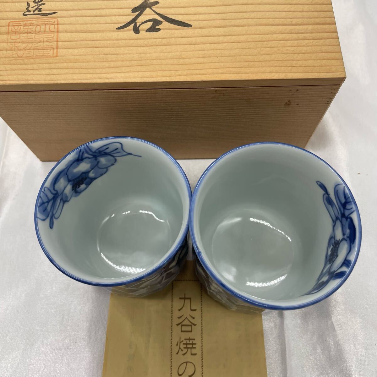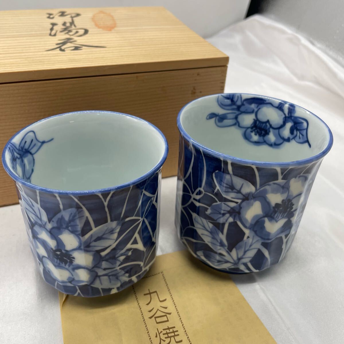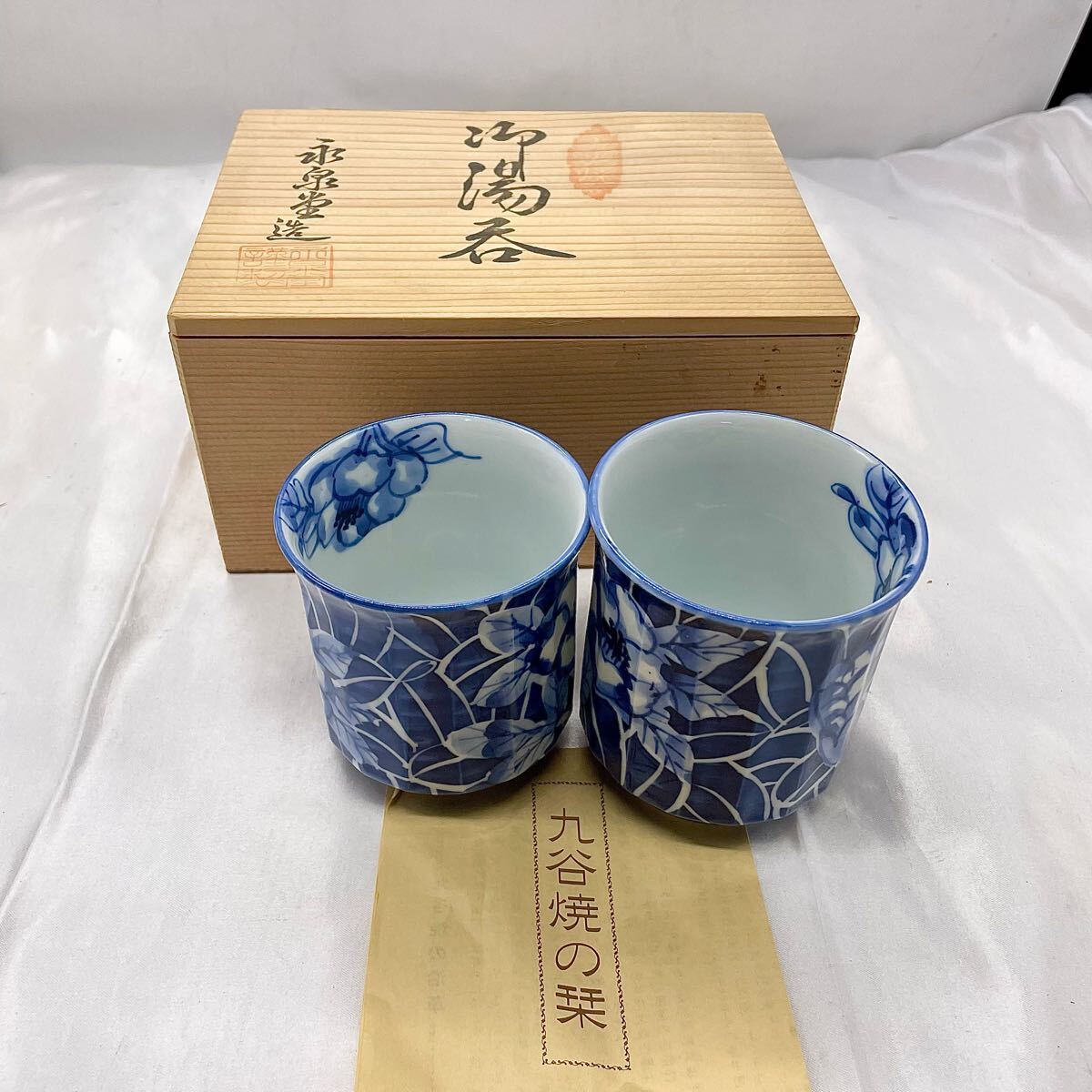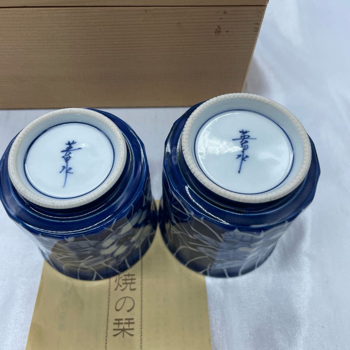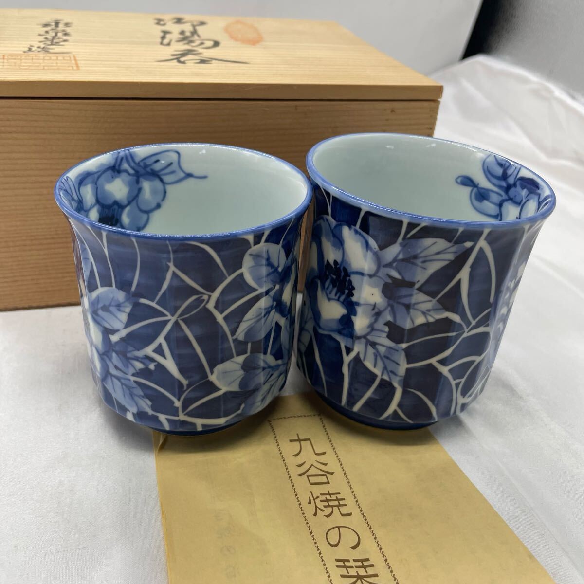 【菖水】美品 夫婦湯呑 染付 花文様 共箱付 茶器 2客セット 木箱付き 和食器 ペア 煎茶道具 お茶 おもてなし 来客 食器 u9848