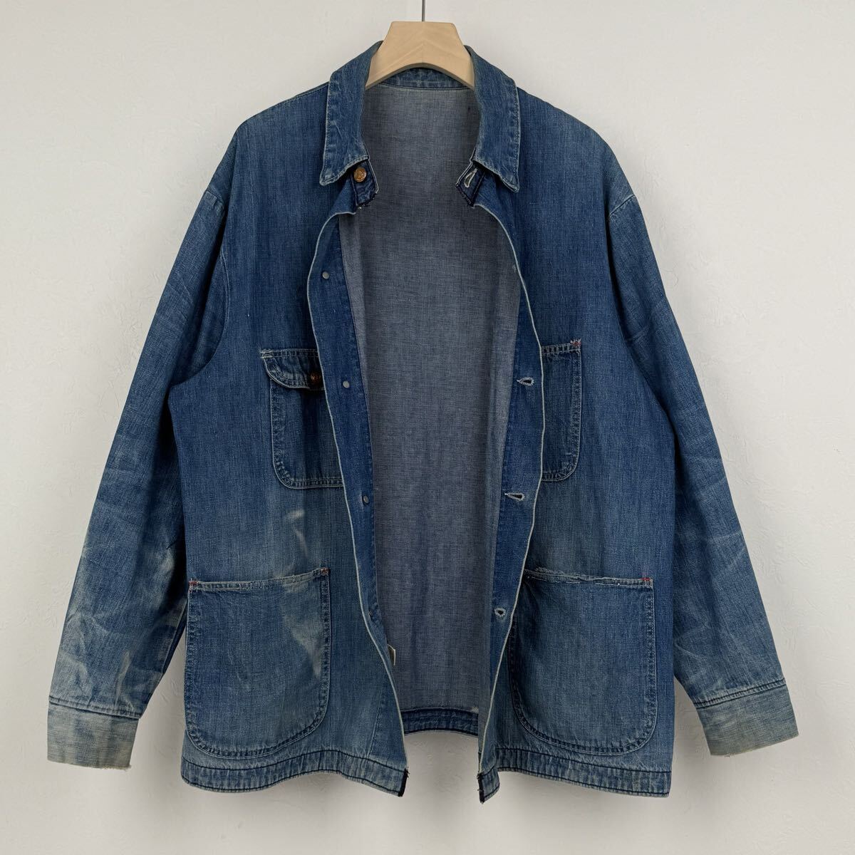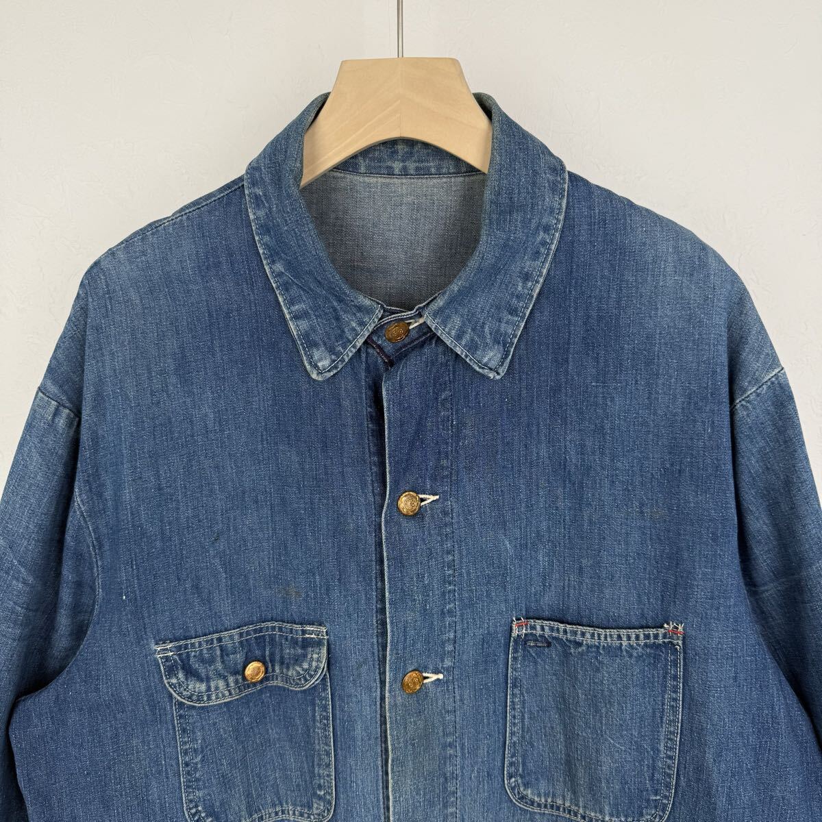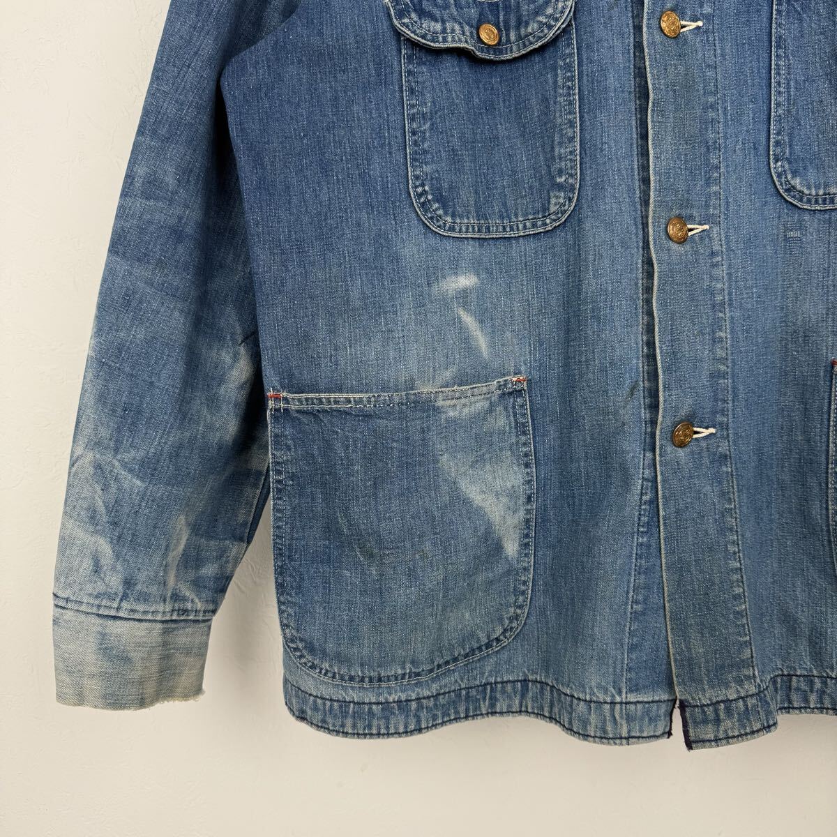 ボタンからおそらくBLUE BELL系だと思われます。閂は赤糸、薄めのデニム生地が使用されており、雰囲気のある色落ちが楽しめます。